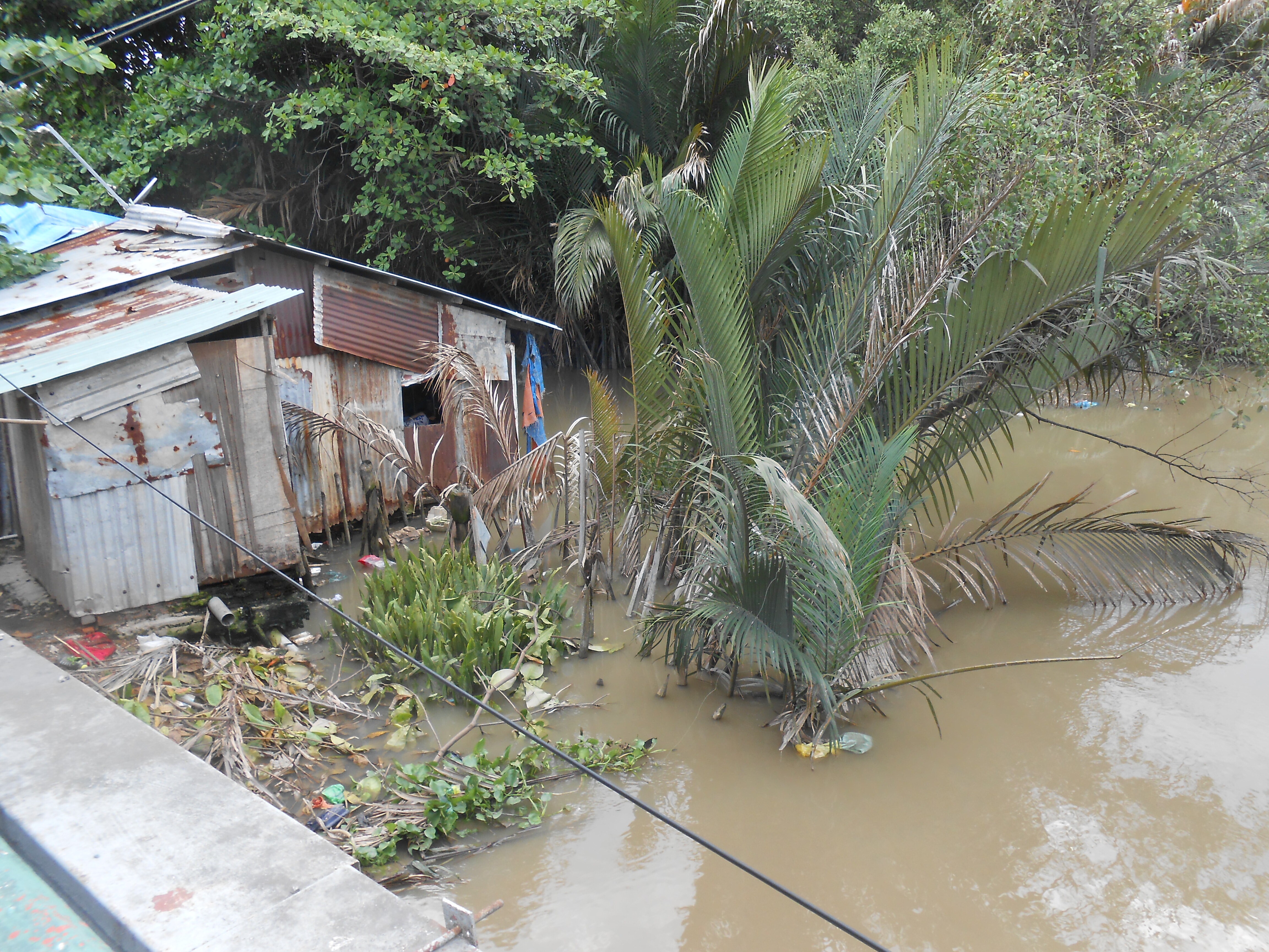 A little father up we came to a bridge. On the map, the bridge appears to cross over the Rach Thay Tieu, but this whole area is threaded with rivers so it’s hard to tell. The metal building half in the water on the right is the downhill side of a cafe that looks perfectly nice on the uphill side. The picture on the left shows a boat in the distance that has a dragon eye painted on the prow. You can click on these pictures to enlarge them, by the way.