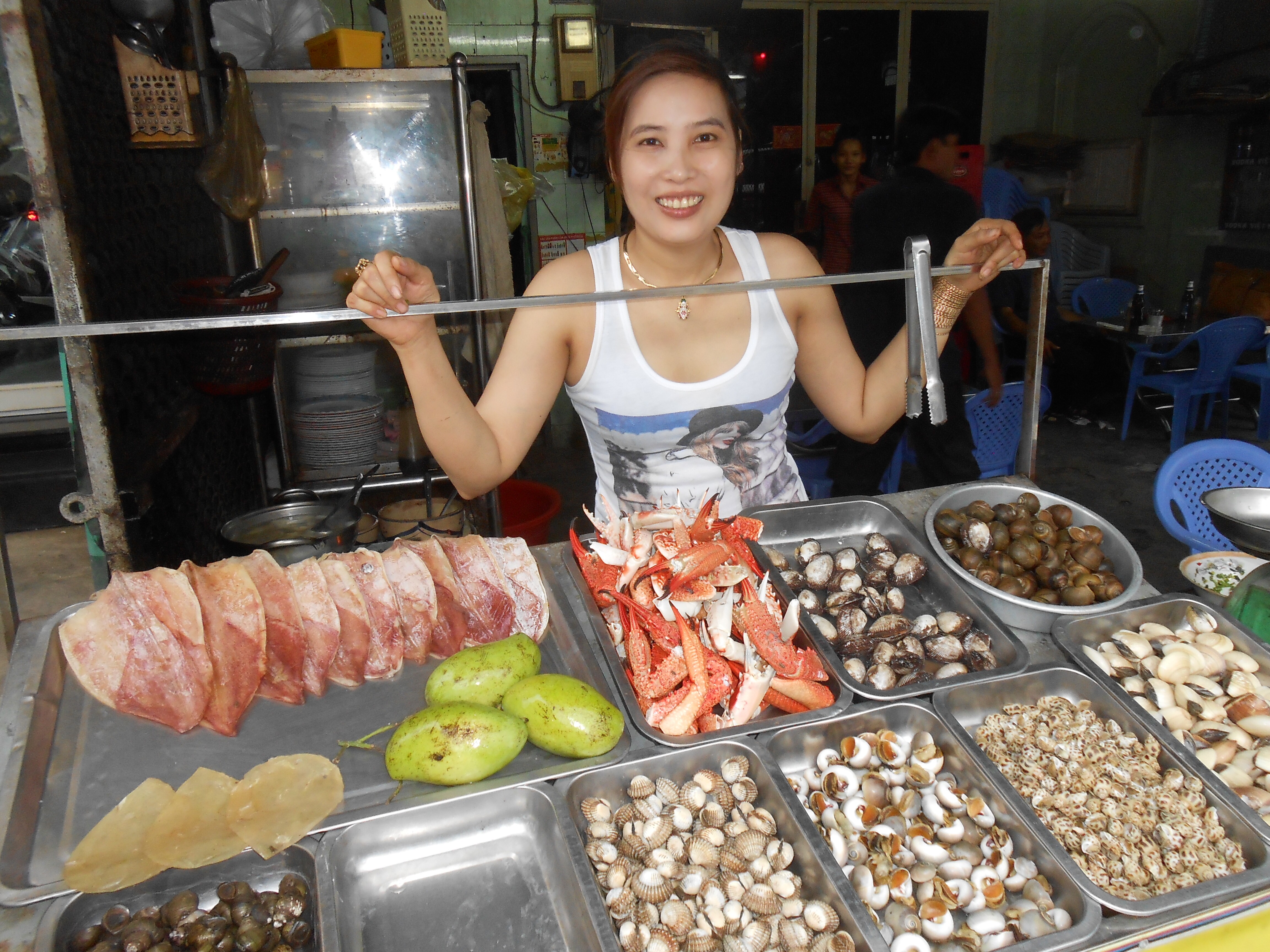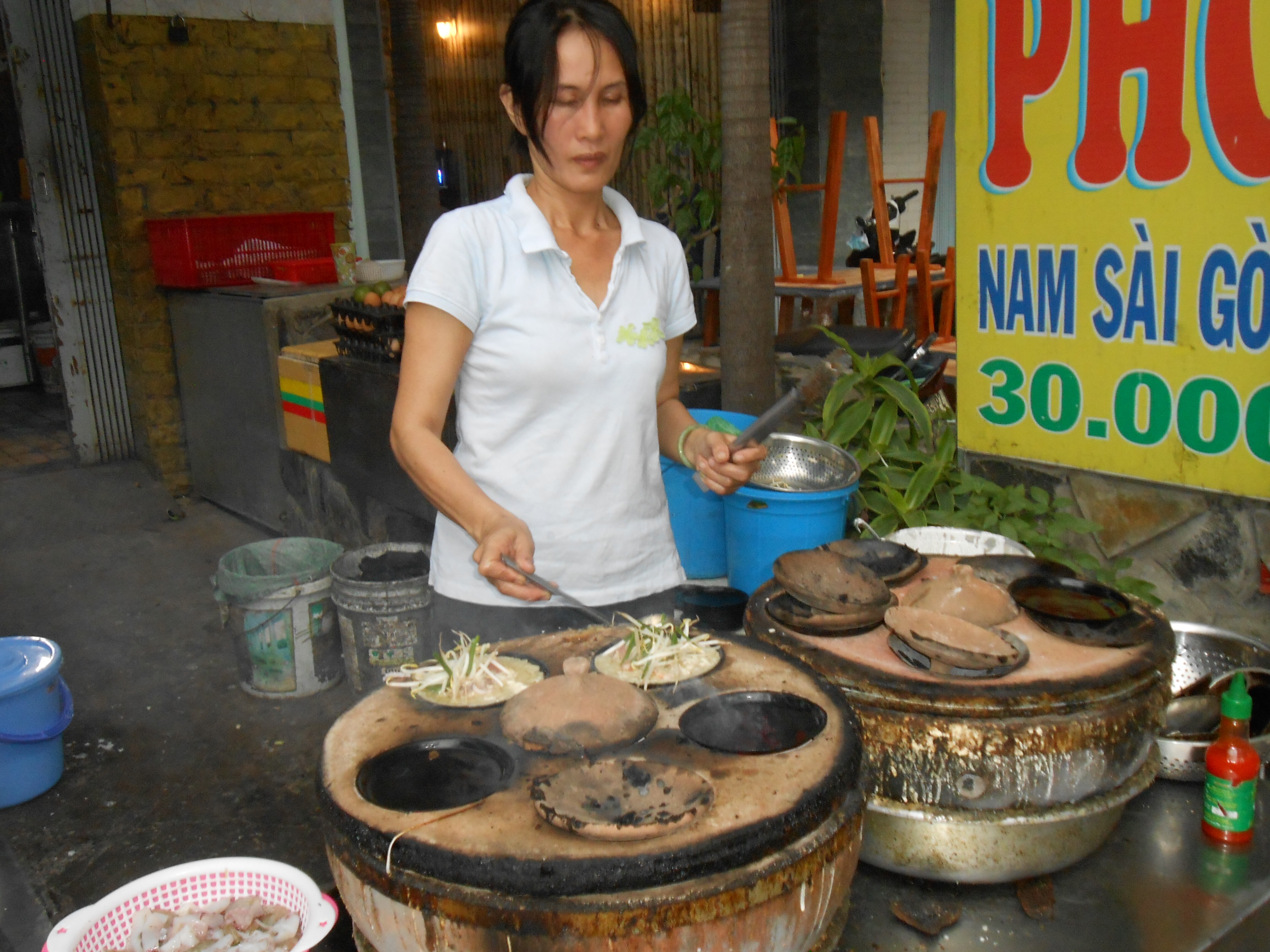 Here are two eating establishments. I asked permission to take these pictures, by the way. The woman on the left is cooking over charcoal in little hot clay plates. First she puts oil, then some maybe living seafood creature, and then some batter which bubbles up, and then she adds greens and veggies. I don’t know what happens next.