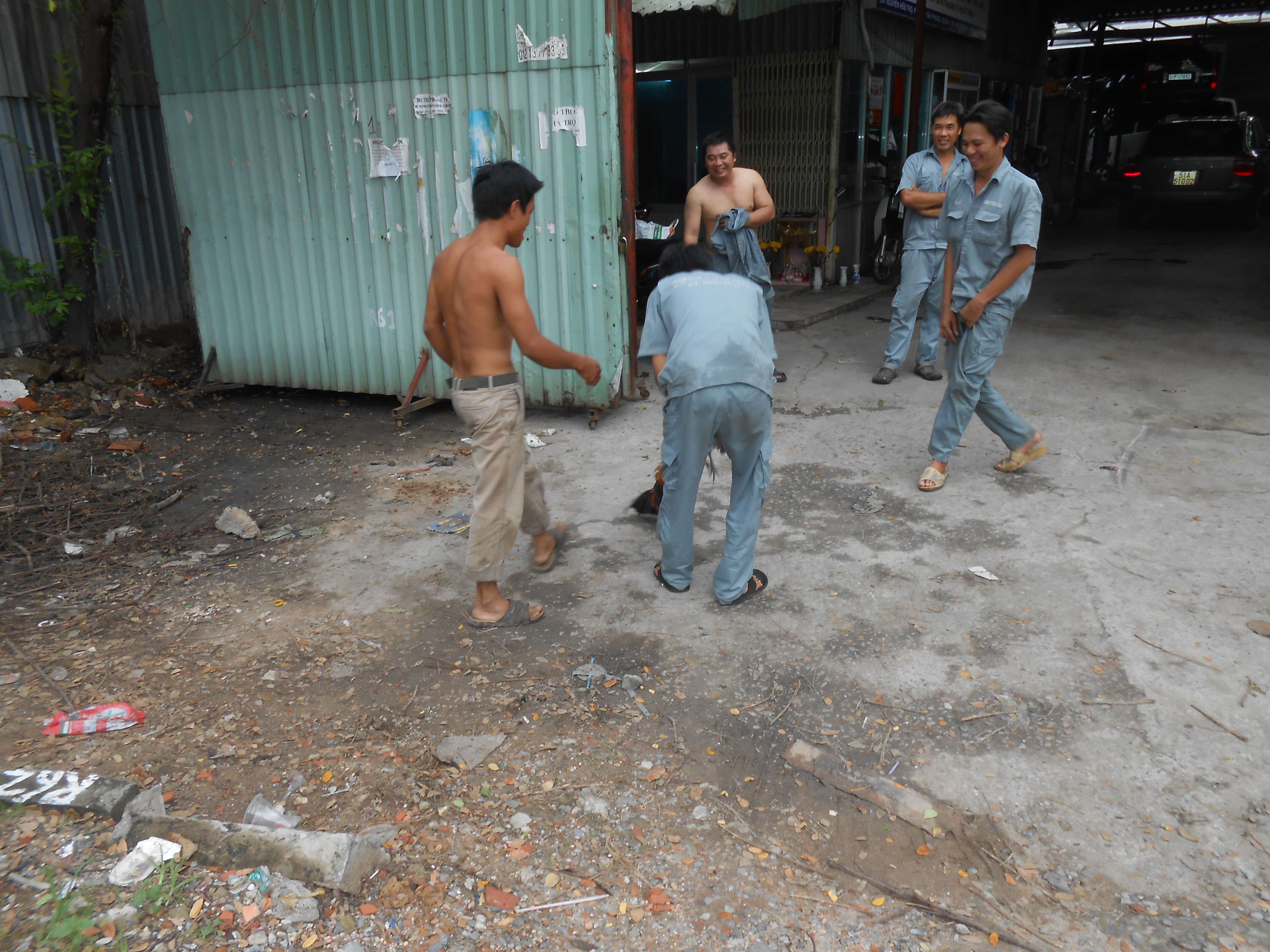 Next to that cafe there was a small cockfight going on. There are chickens all over the place, including in the dorm canteen which is one the ground floor and open air, and I assumed they were being helpful with bugs and crumbs, but here were two roosters that provided entertainment. The fight did not seem serious. The white rooster was allowed to run away.