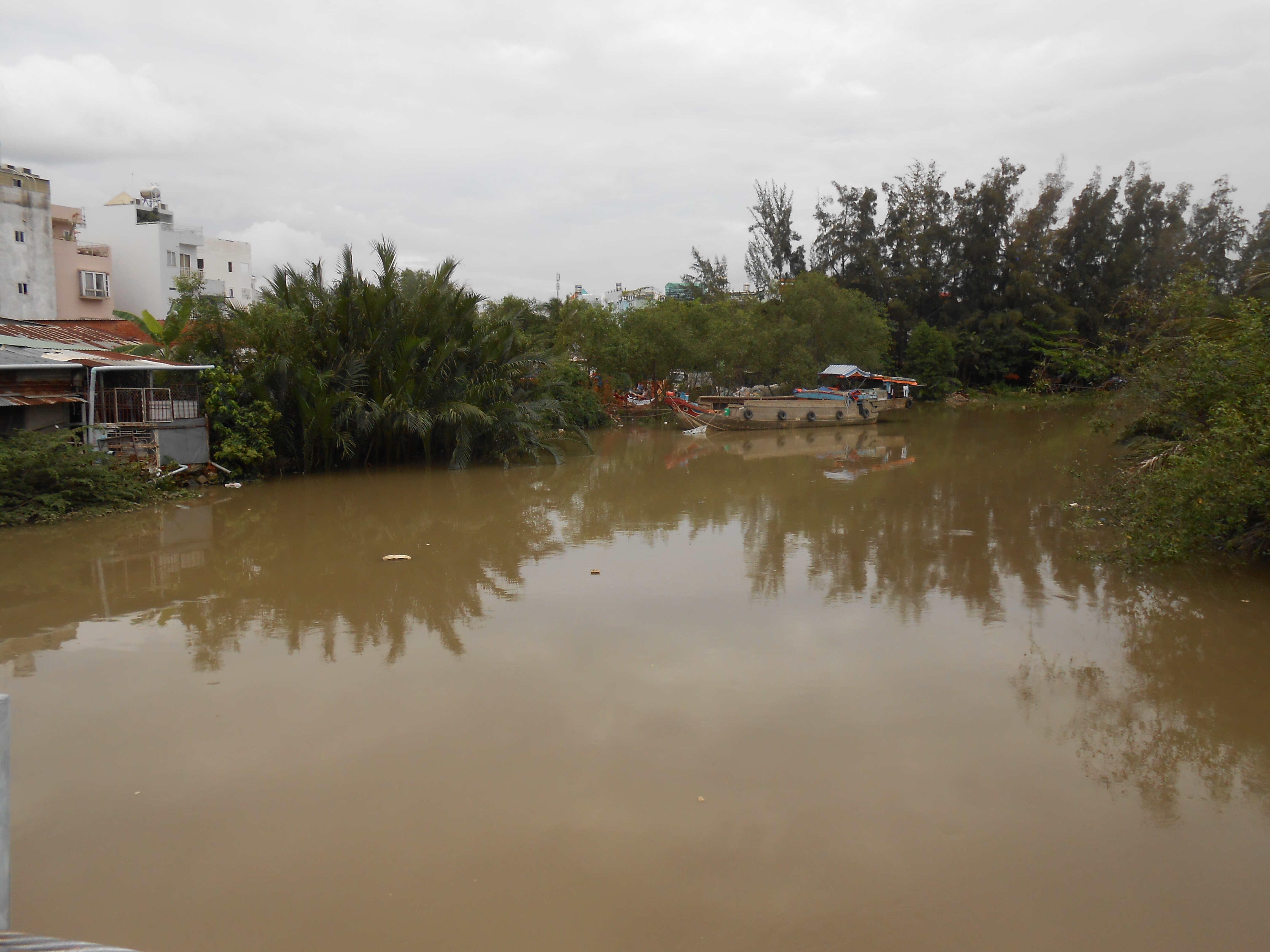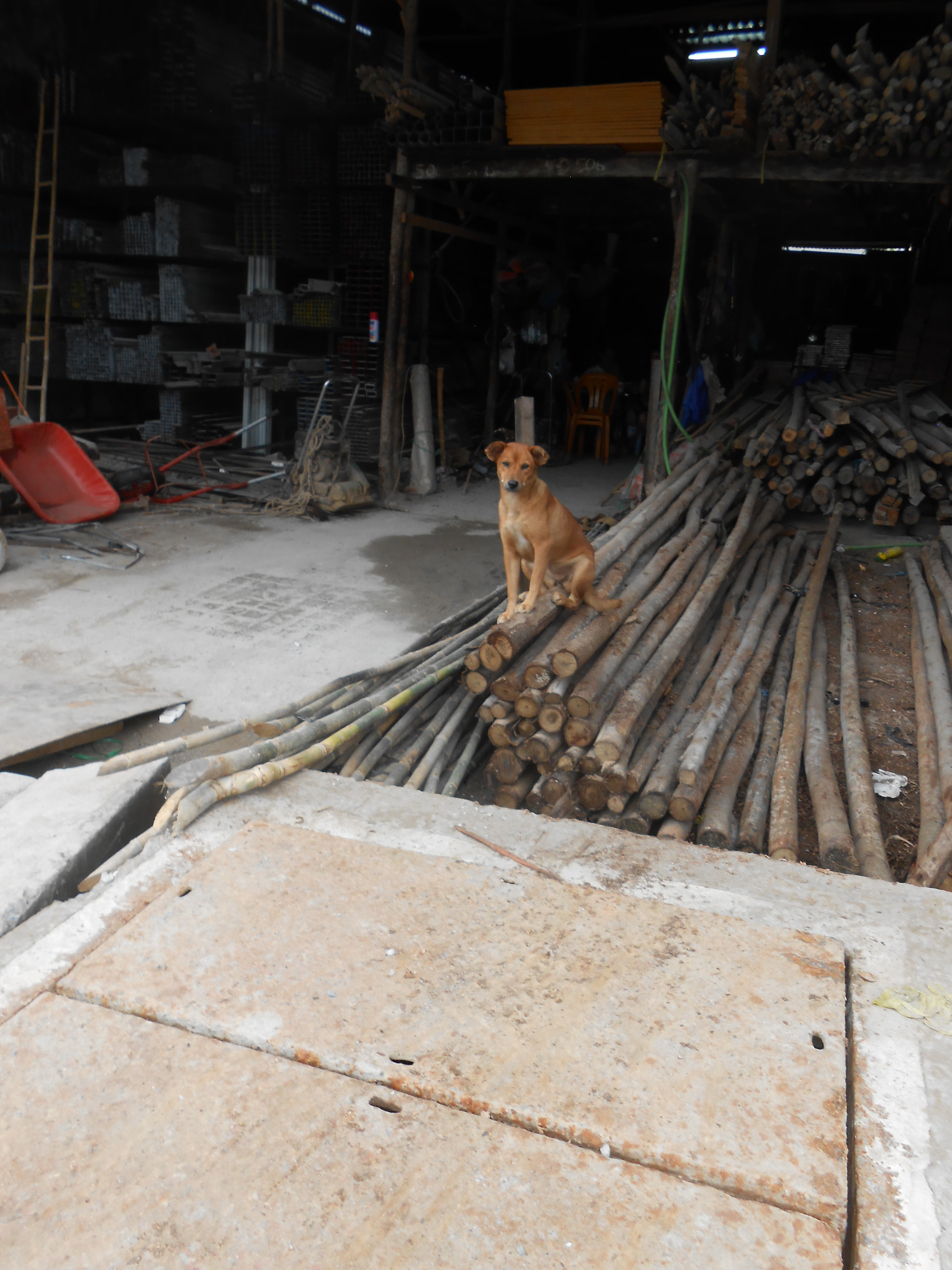 Here is a little yellow dog sitting on a pile of wooden poles in a construction materials shop. Saigonese dogs are all this same yellow short-haired mixed breed type. They are not the kind of dog you go up to and pat, although they may come towards you, sniff and then walk away. The guard at the gate near our room has a dog like this. In shops they are mostly sitting on piles of stuff. The poles in this picture are a basic construction item used for holding up roofs or constructing dams. The canal on campus is dammed up with poles like these, driven vertically into the muddy bottom and then banked with mud and sandbags.