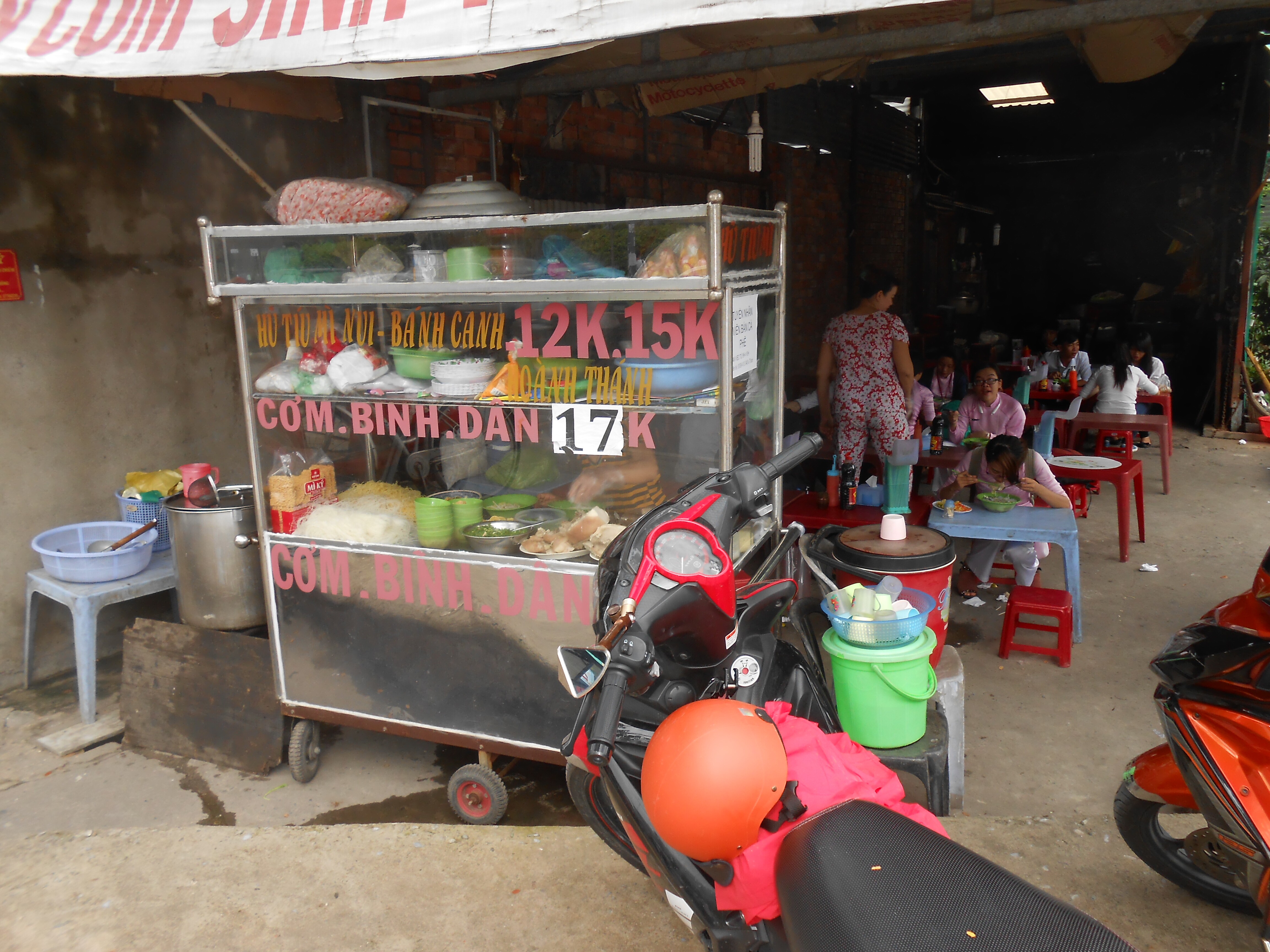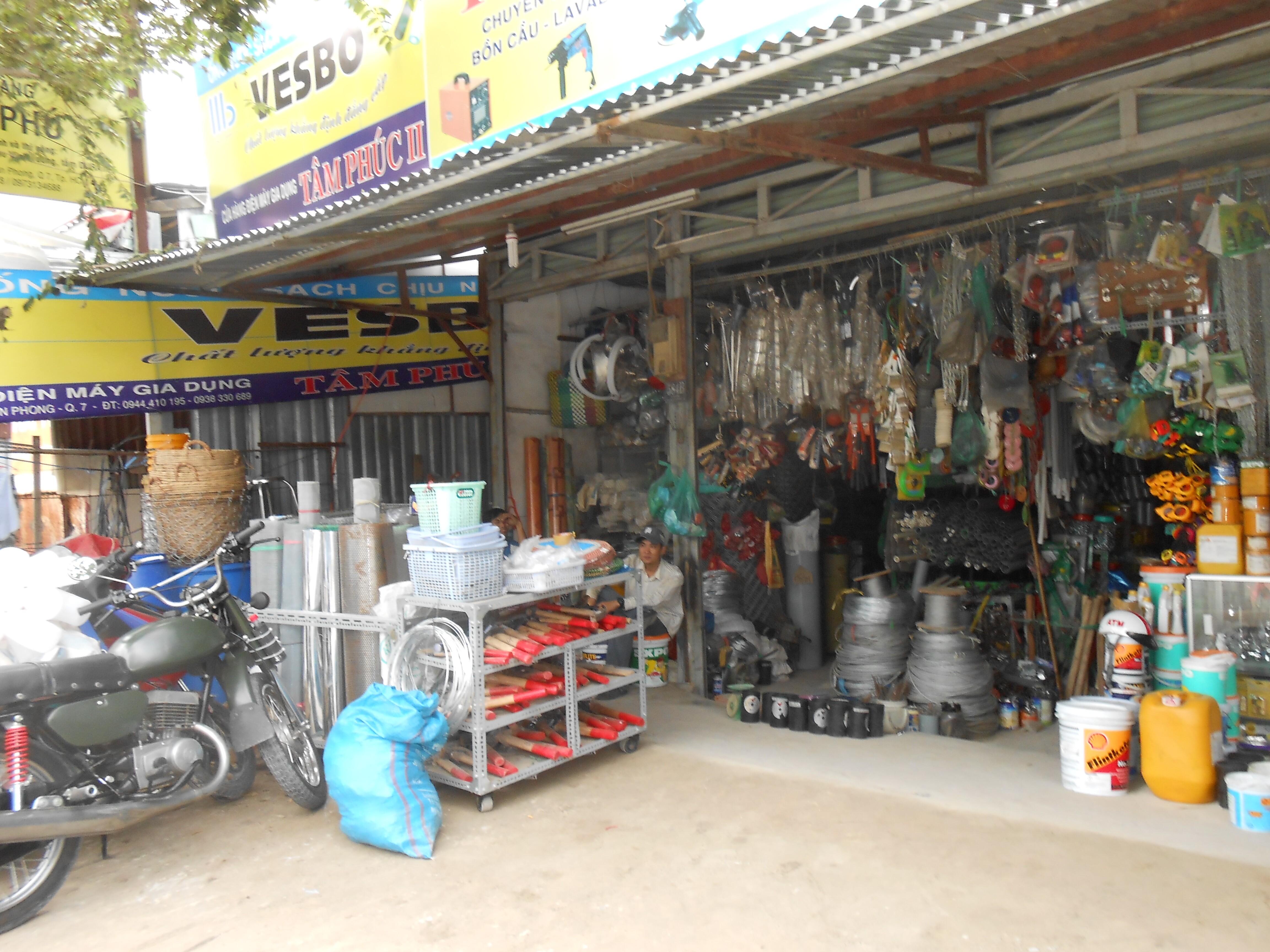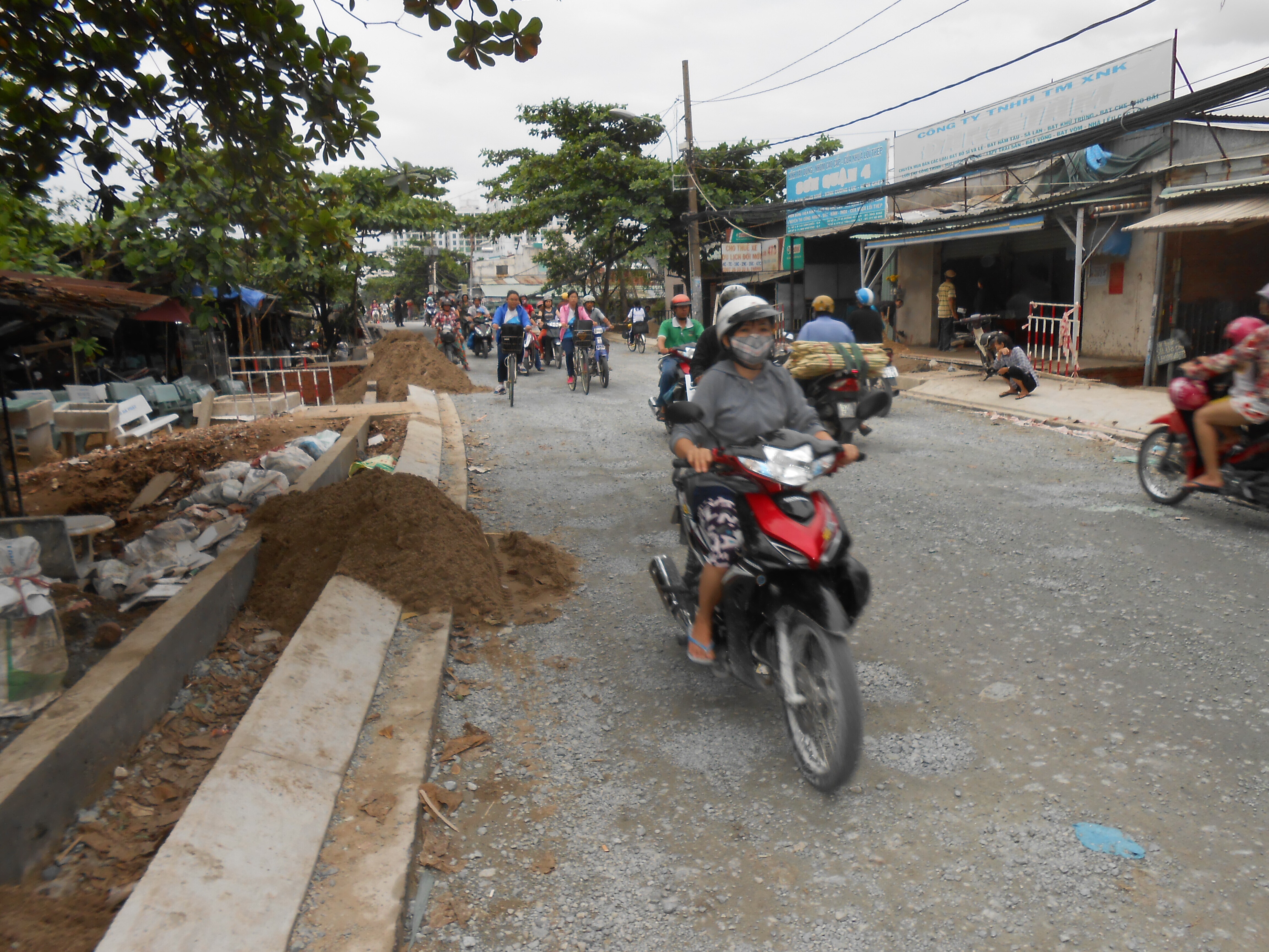 We came to the corner and turned left up Le Van Luong. This street is really one lane, with most of the traffic going all in one direction. Right now, it’s crushed gravel. They are building a new sidewalk on the east side, plus new gutters on both sides of the street. It almost looks as if the street itself is being elevated. One result of that is that in front of many of the shops, people have big piles of dirt that they are shoveling into their houses to raise the floors, which are dirt underneath whatever surface they’ve put on top.