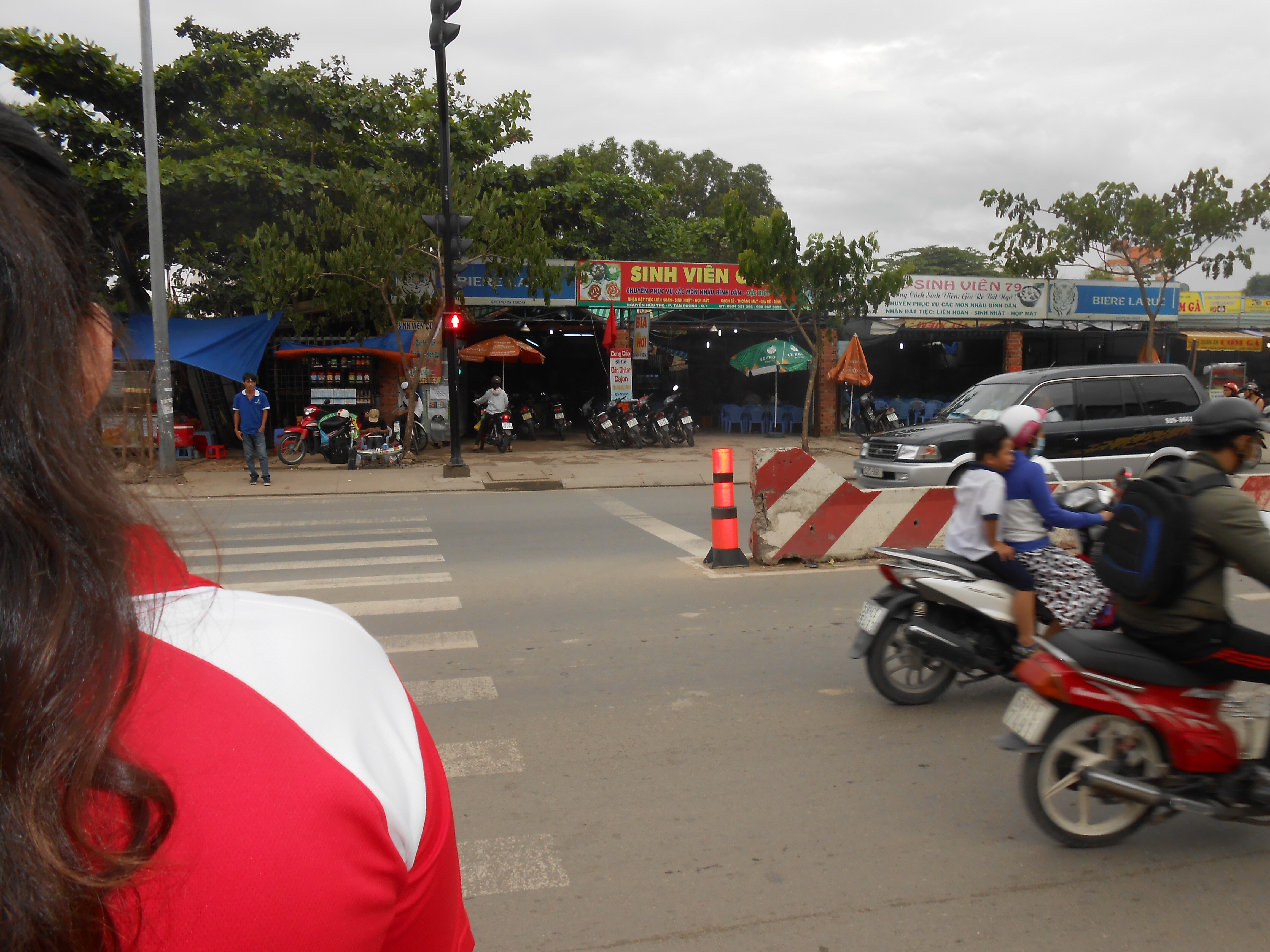 Getting to Le Van Luong street meant crossing Nguyen Huu Tho Street, a large divided boulevard. We are getting better at crossing streets. Crossing at a crosswalk is a good idea, especially if they have a pedestrian signal light. The idea is to start walking and proceed smoothly, not changing your pace or direction, and leave it up to the motor scooters to avoid you. They are pretty good at it. So here is a picture of the cross walk: