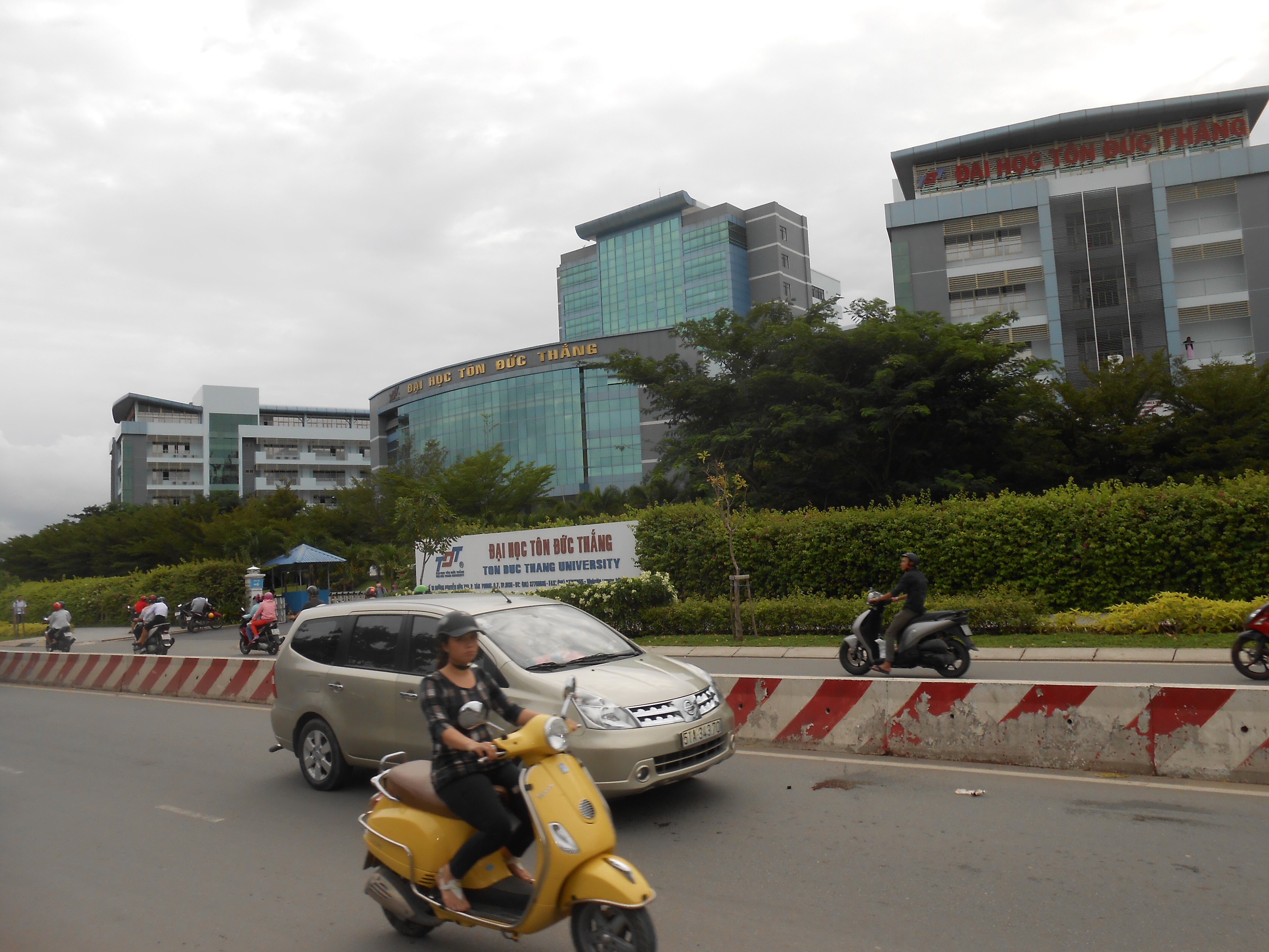 This for some reason does not show the hundreds of motorbikes that were really there. But never mind. See the little shops lined up on the other side of the street? Those are mostly little cafes, selling different kinds of food that they cook right there on the sidewalk. Here is what’s on the other side of the same street: Ton Duc Thang, modern high-rise technical university.