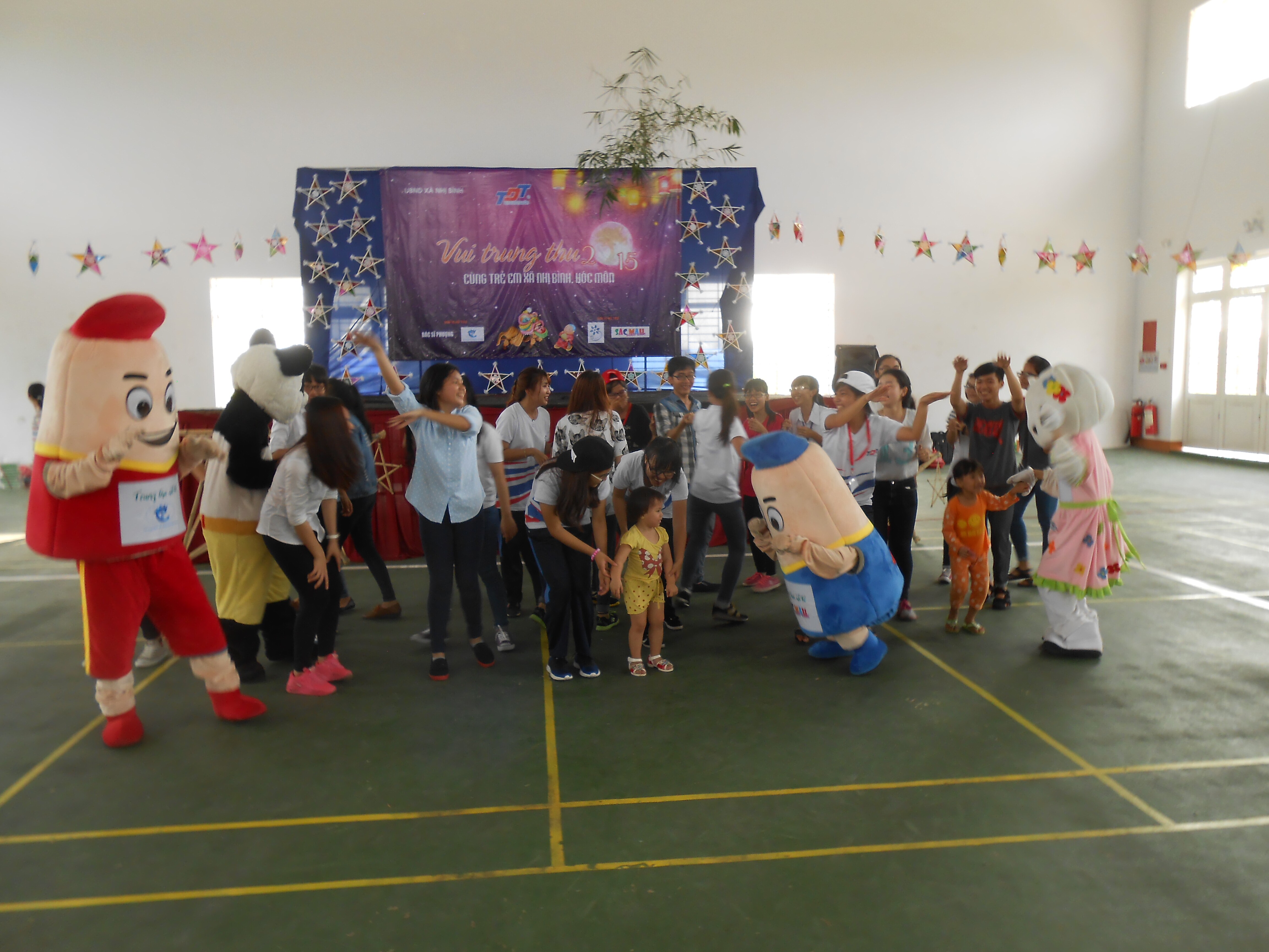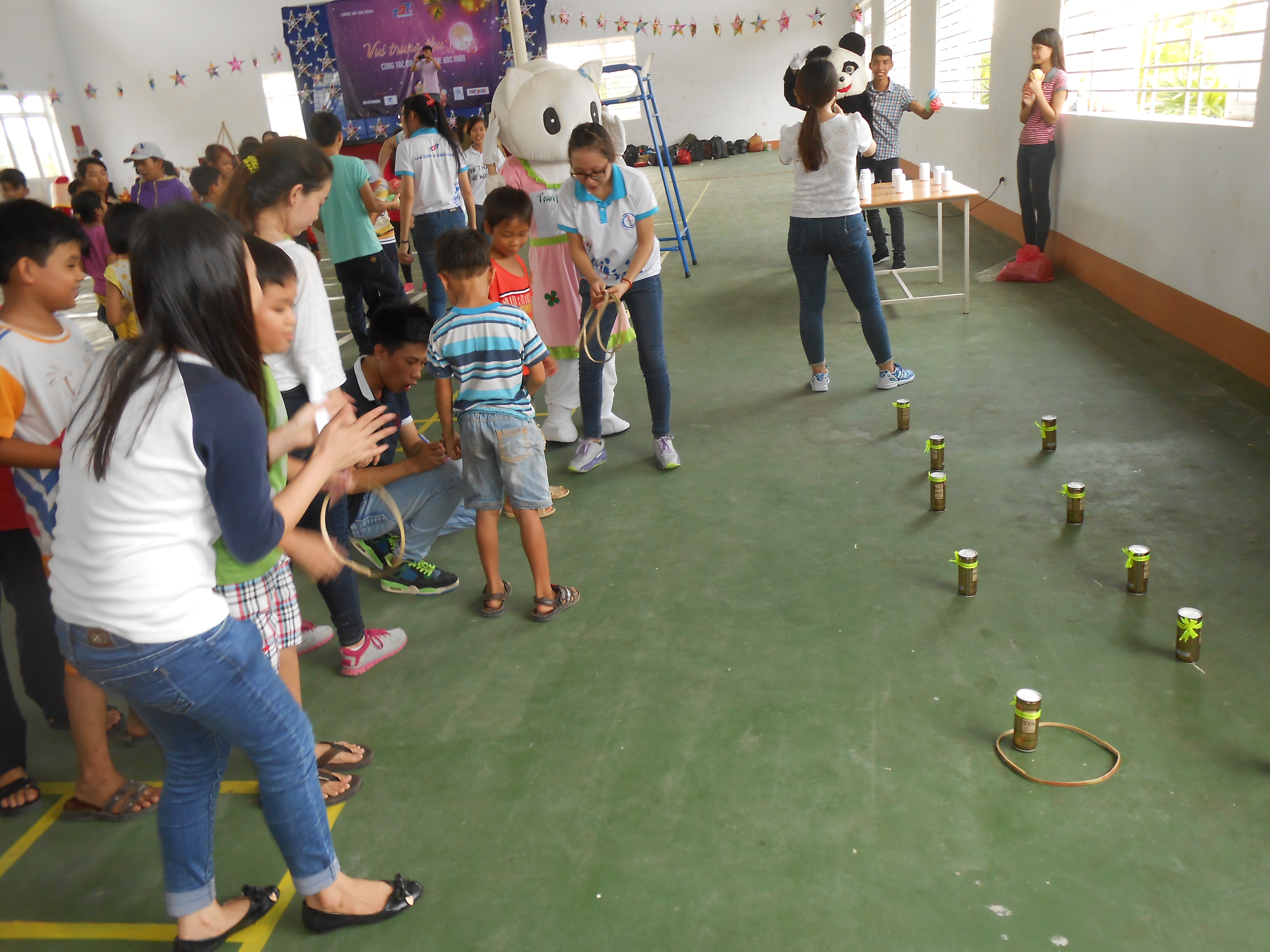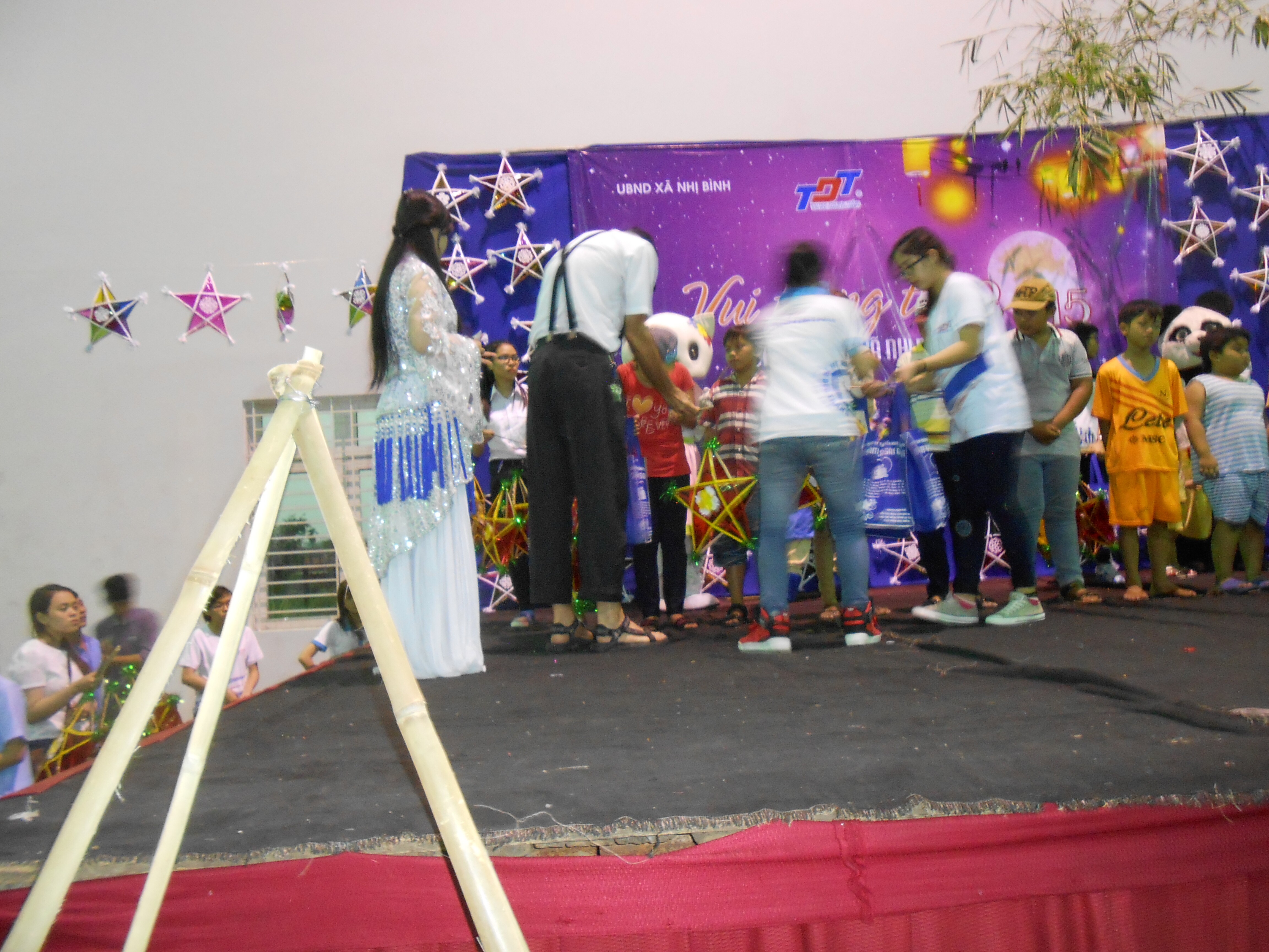 The event took place in a large high-ceilinged cement building with a metal roof that is the community meeting and activity center of the village. Inside the building, which was all one room with lines painted on the floor for volleyball or badminton courts, the students had set up games like throw-the-coconut-at-the-water bottles, or toss the bamboo hoop over the cans. There was a stage at one end of the room. Adorning the stage were many stars made of colored paper glued to a bamboo frame and decorated with gold and white paper. Vinh had told us that the students had made all these stars themselves, even down to making the bamboo frames. They would give them to the children at the end of the celebration, and they’d light candles in them and the children would walk around the village in honor of the Autumn Moon.