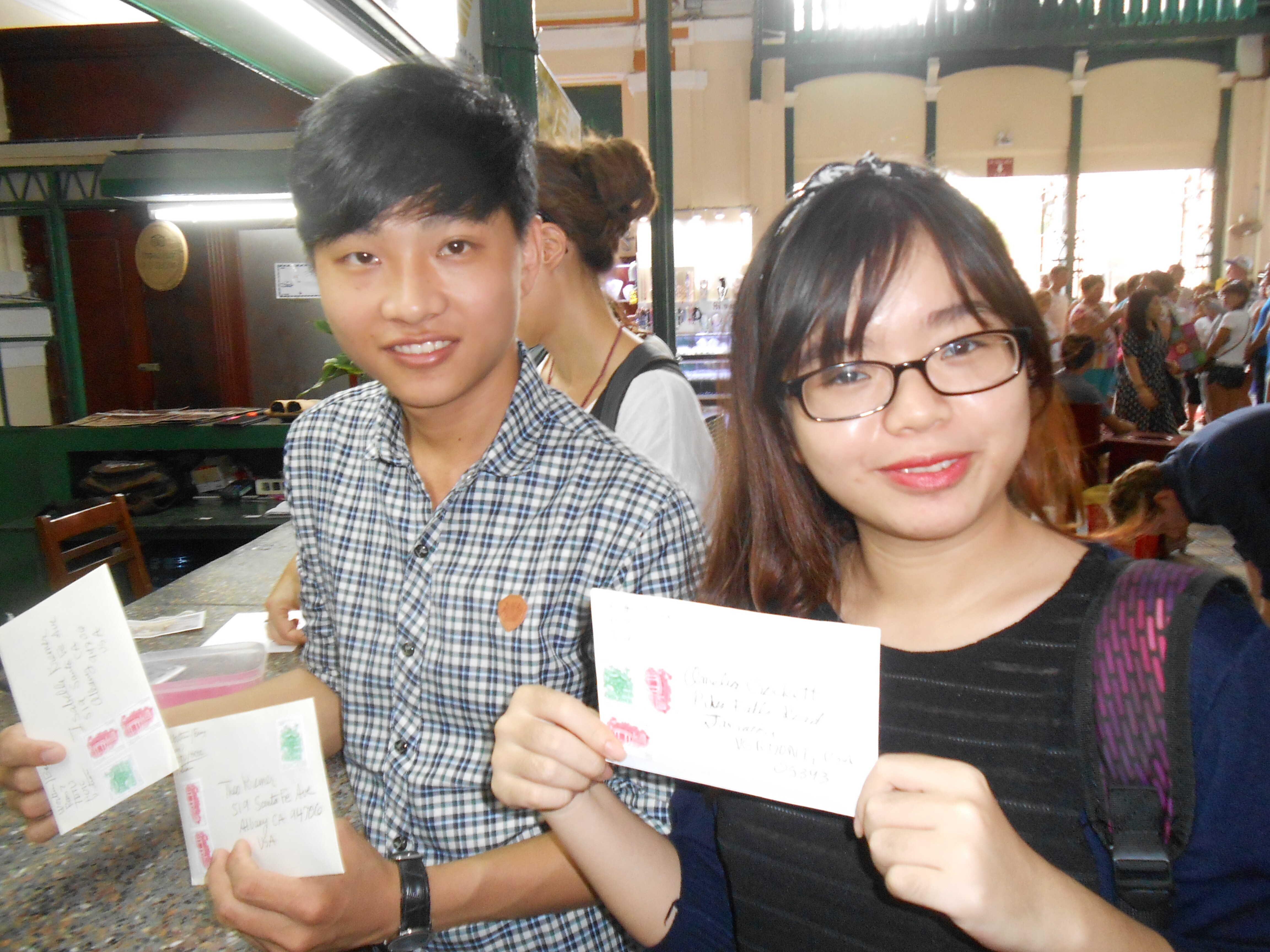 Phone calls between me and Joe ensued: not only the wire on his hearing aid was broken, but also the battery, in this humidity, was going bad. But the driver of the TDTU van was willing to find him at the service center in District 1. It was near the Post Office, so we stopped there and I mailed cards to Lorenzo, Massimo, Theo and Isabelle and Amelia Crockett in Vermont.