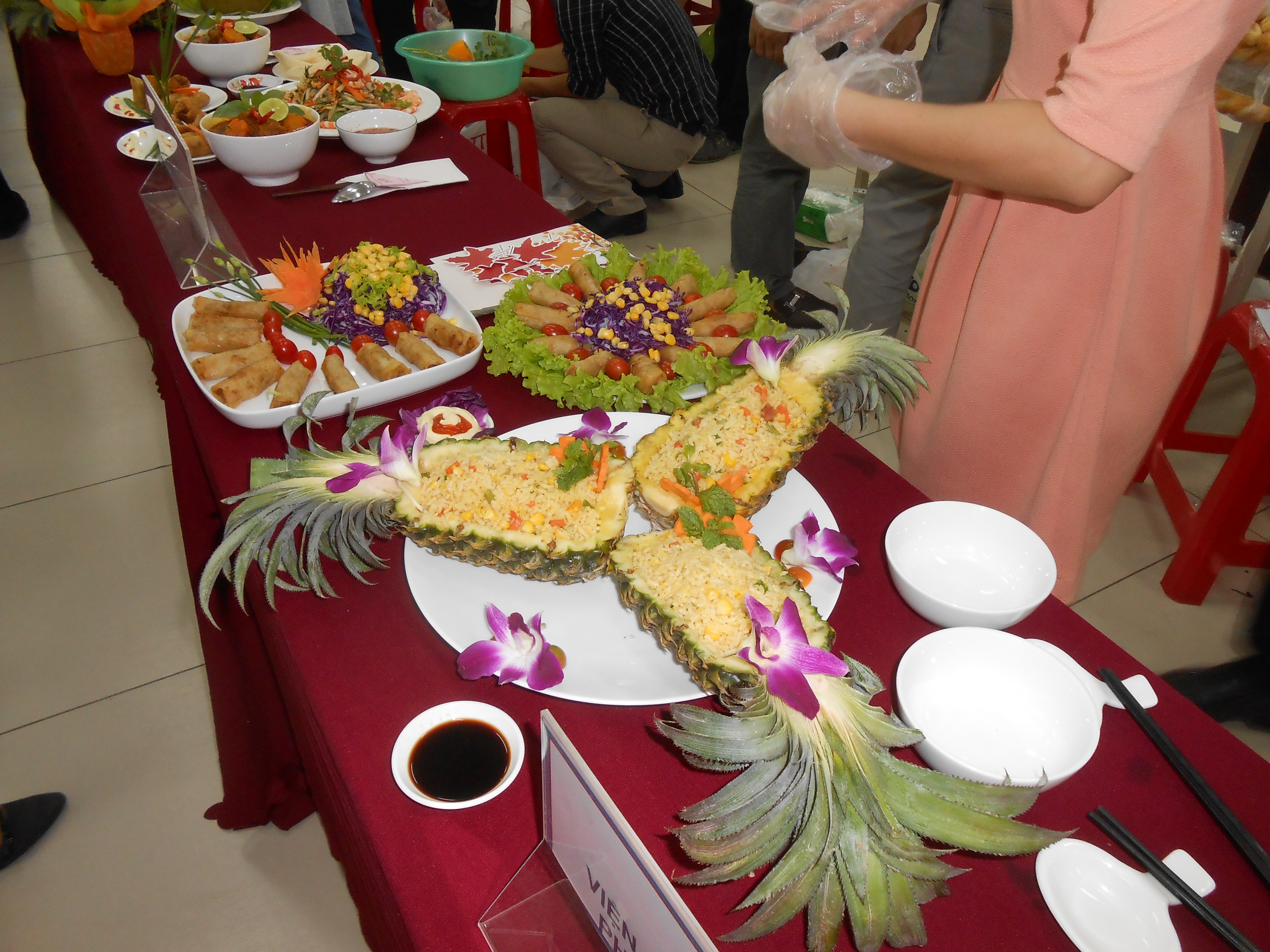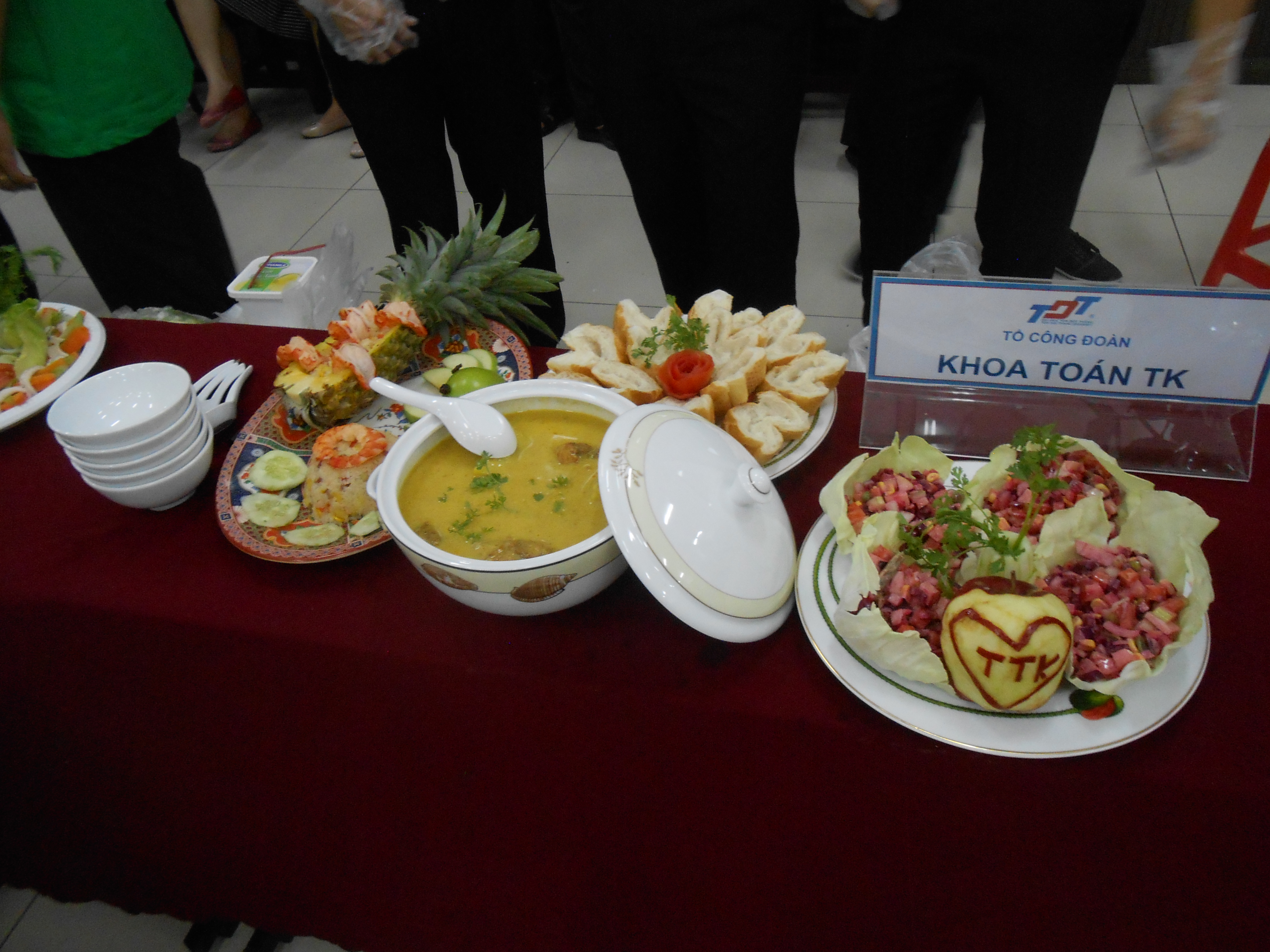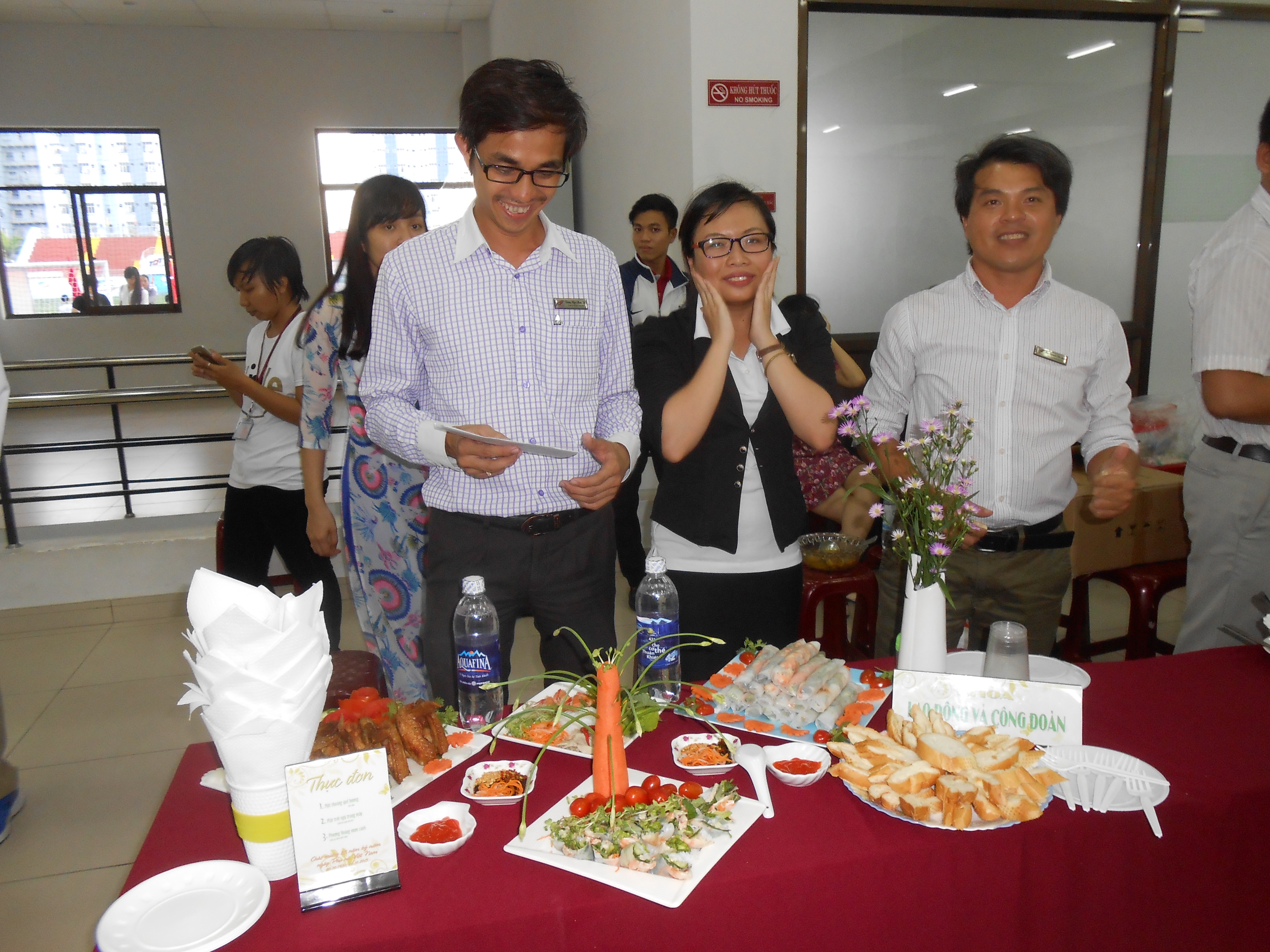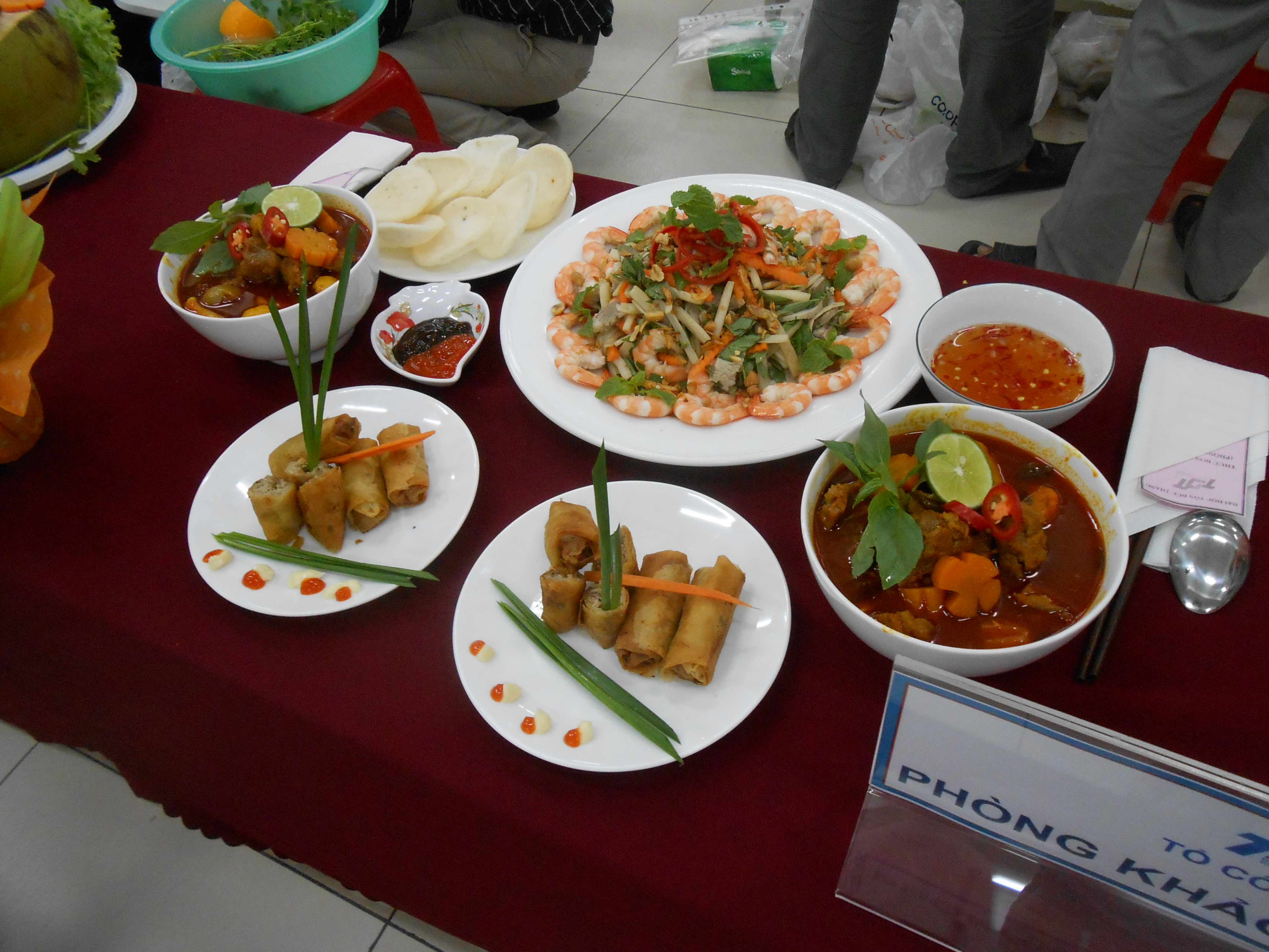Today, October 16, is Women’s Day celebrated by the TDTU union. The way they celebrate it is with a food contest. Every department competes by bringing food. You cook it at home and bring it in with your serving dishes and take it to the gym, where tables are set up in a U-shape. Then three people, of whom only one can be a woman, prepares your department’s food for presentation. This is men doing women’s work. An outside famous chef and two other people serve as the judges.