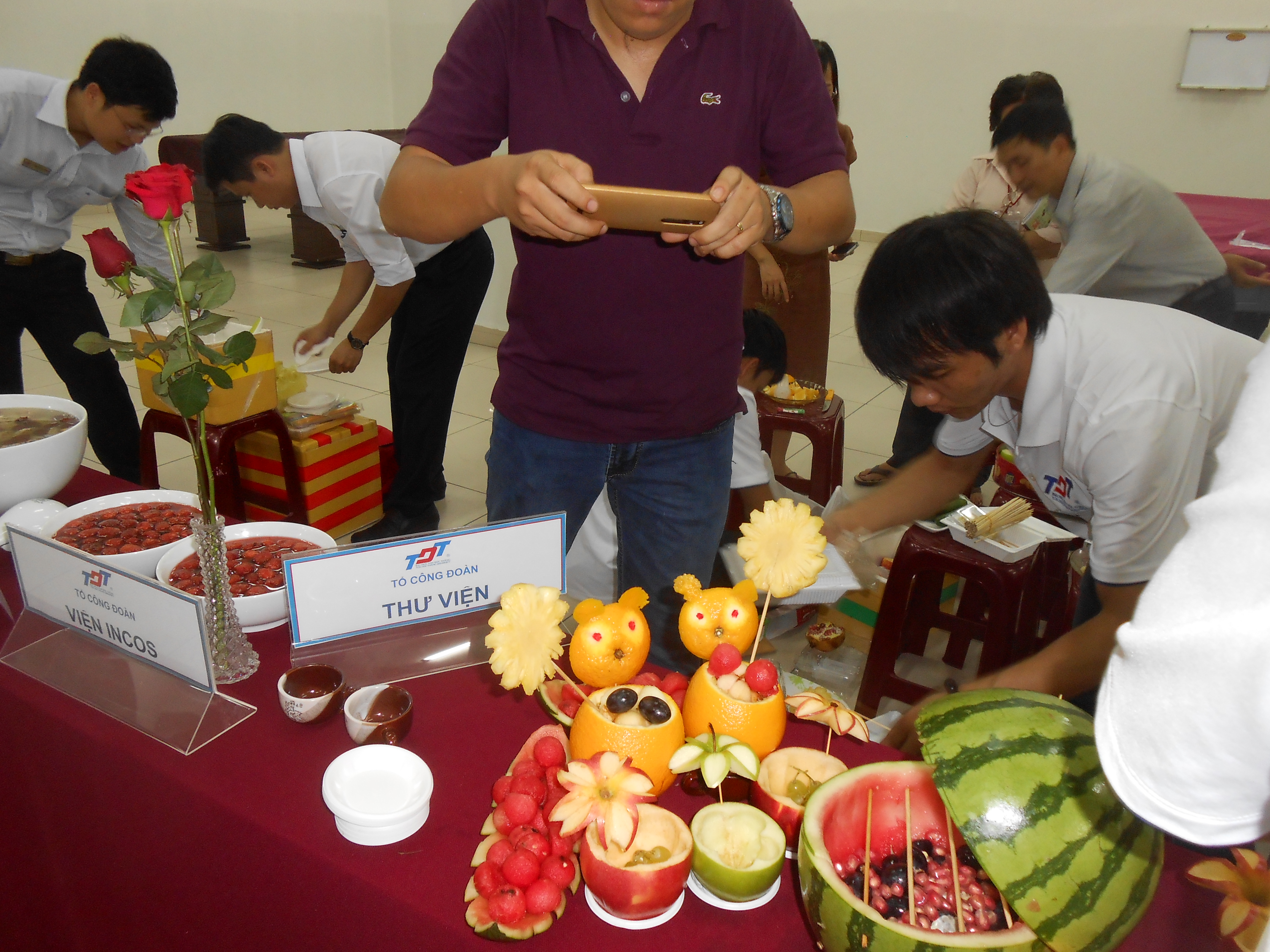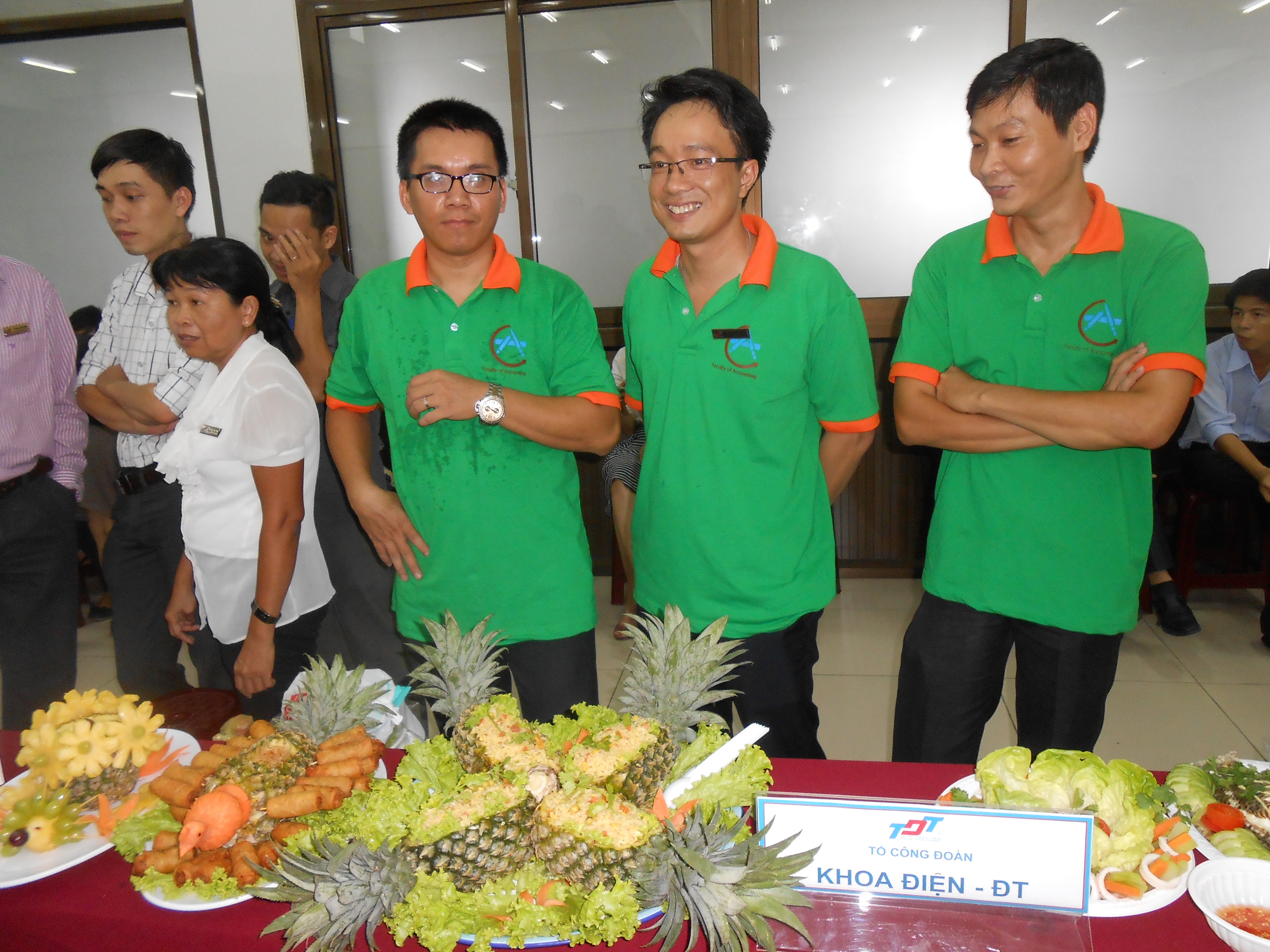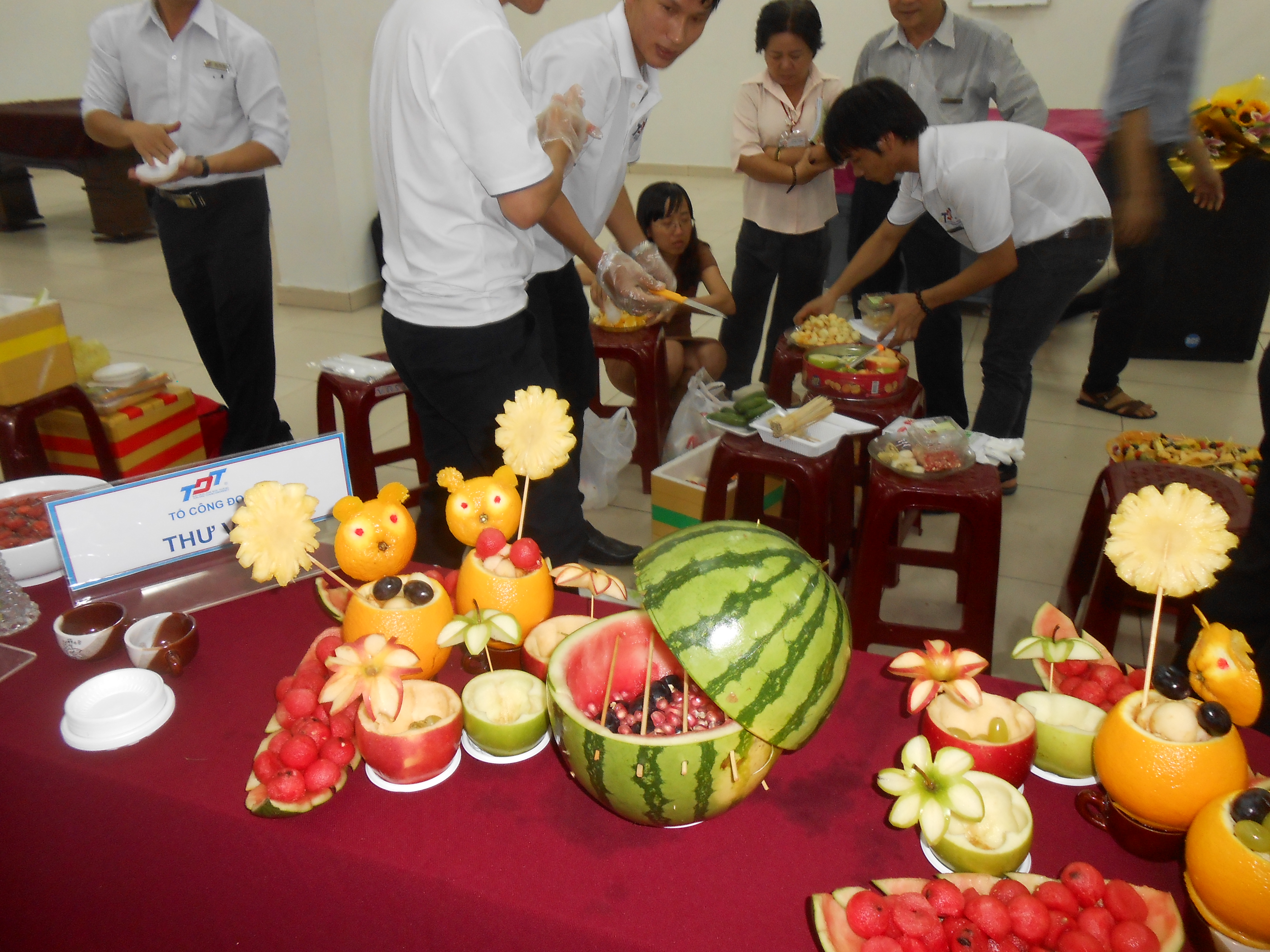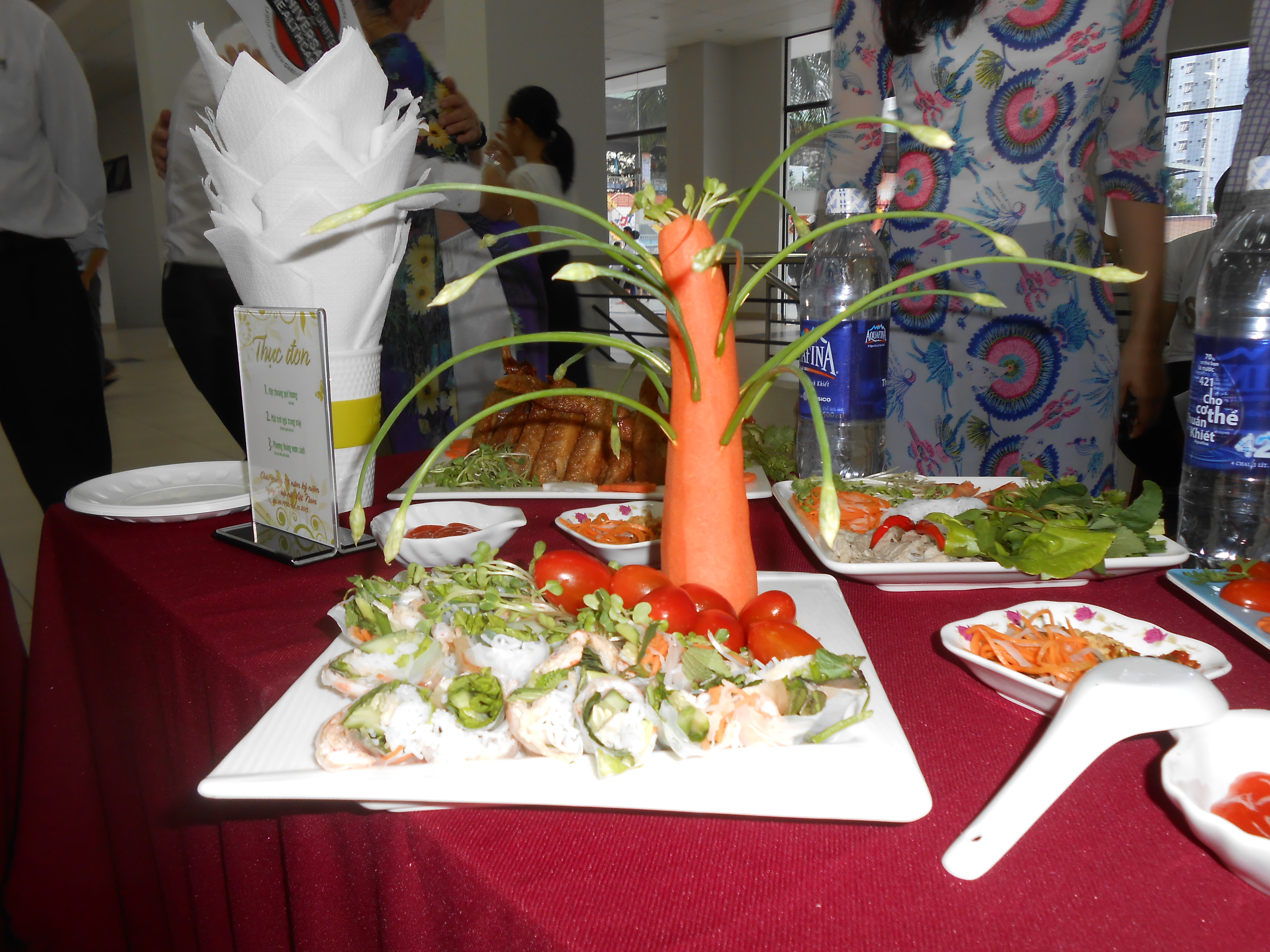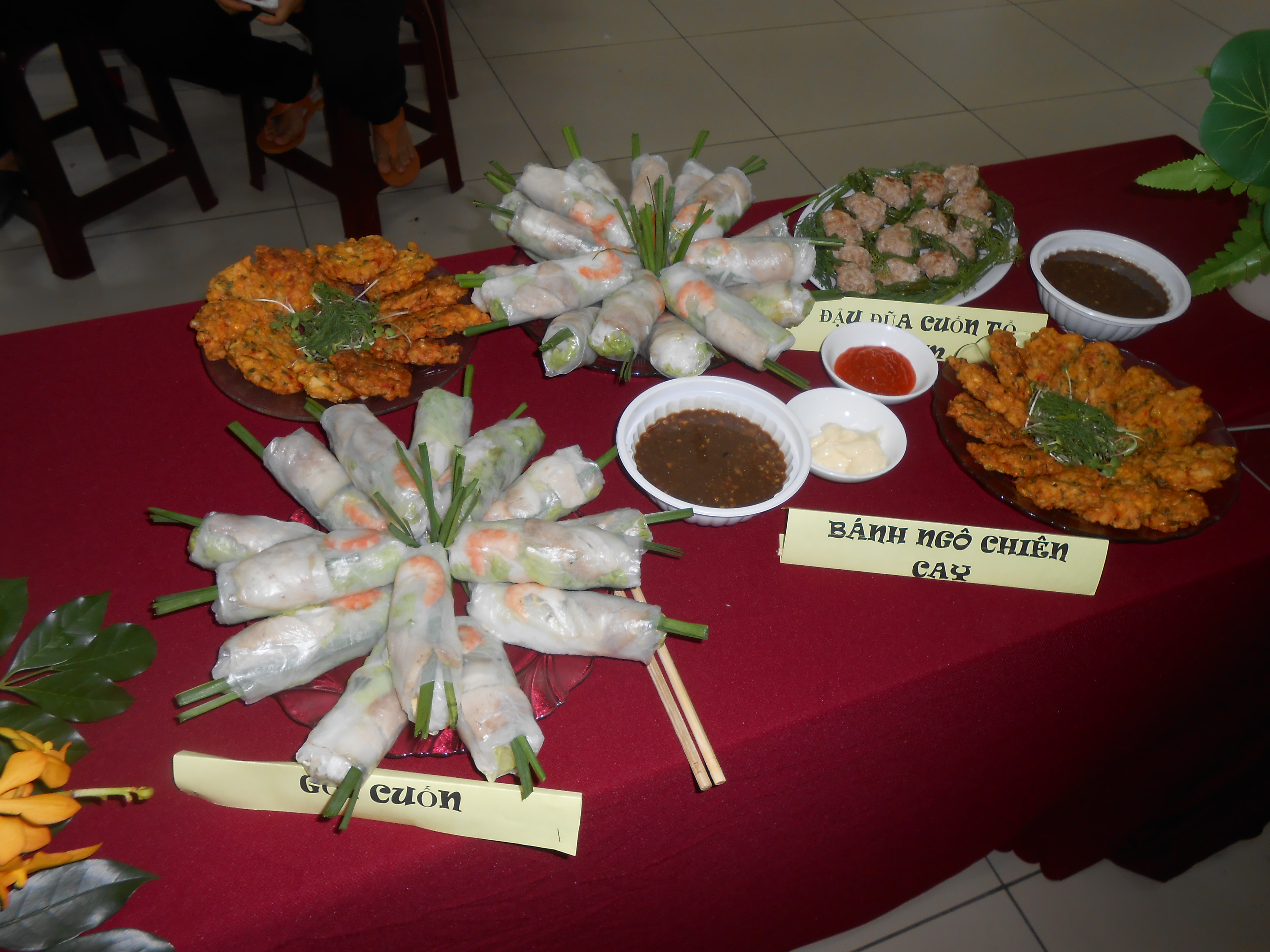 Today, October 16, is Women’s Day celebrated by the TDTU union. The way they celebrate it is with a food contest. Every department competes by bringing food. You cook it at home and bring it in with your serving dishes and take it to the gym, where tables are set up in a U-shape. Then three people, of whom only one can be a woman, prepares your department’s food for presentation. This is men doing women’s work. An outside famous chef and two other people serve as the judges.