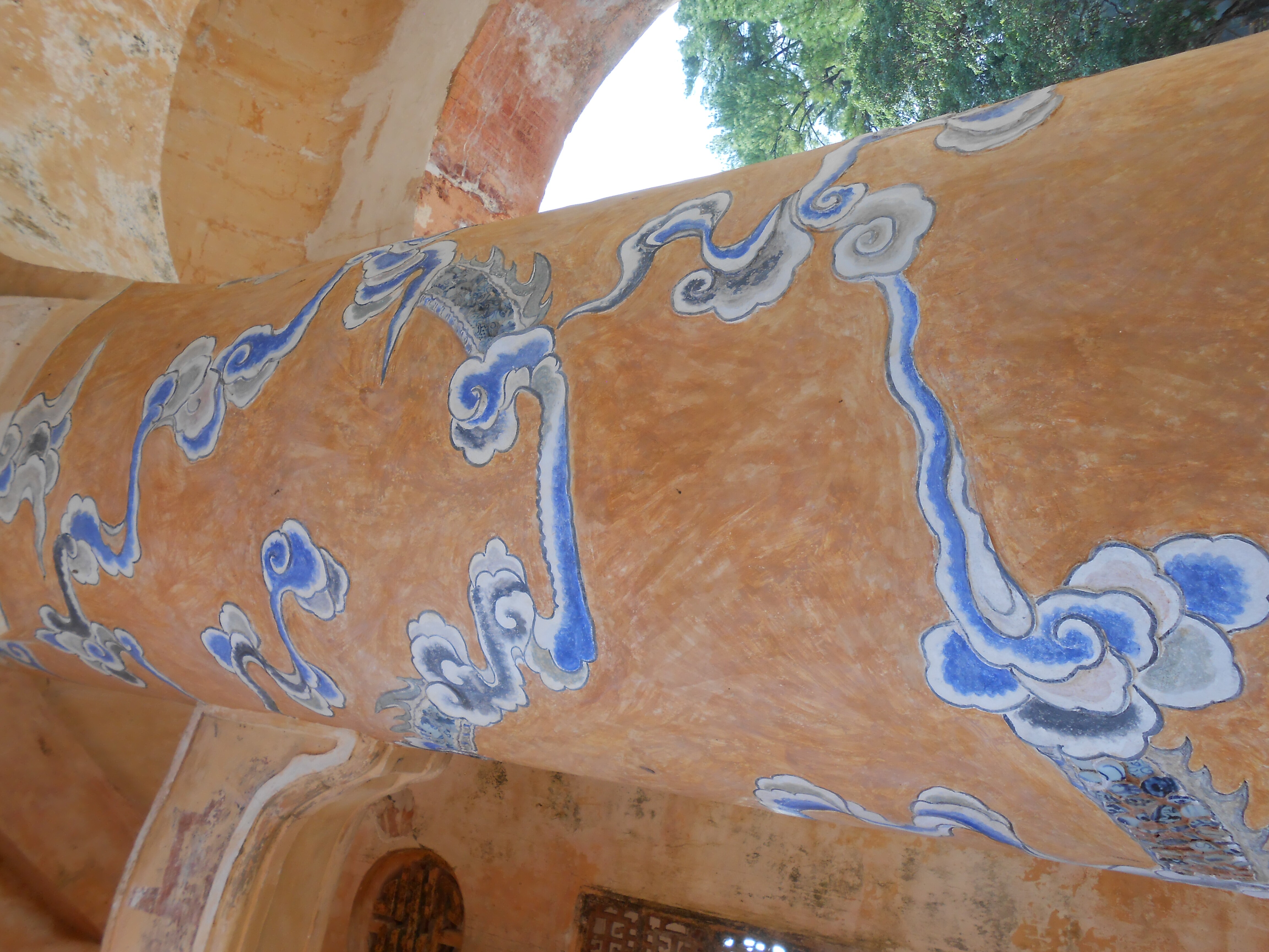 Painted clouds and flying dragons on the pillars and walls of the tomb of Le Duc, at his country palace, also a tomb. This is out among hills and has a lake with an island in it.