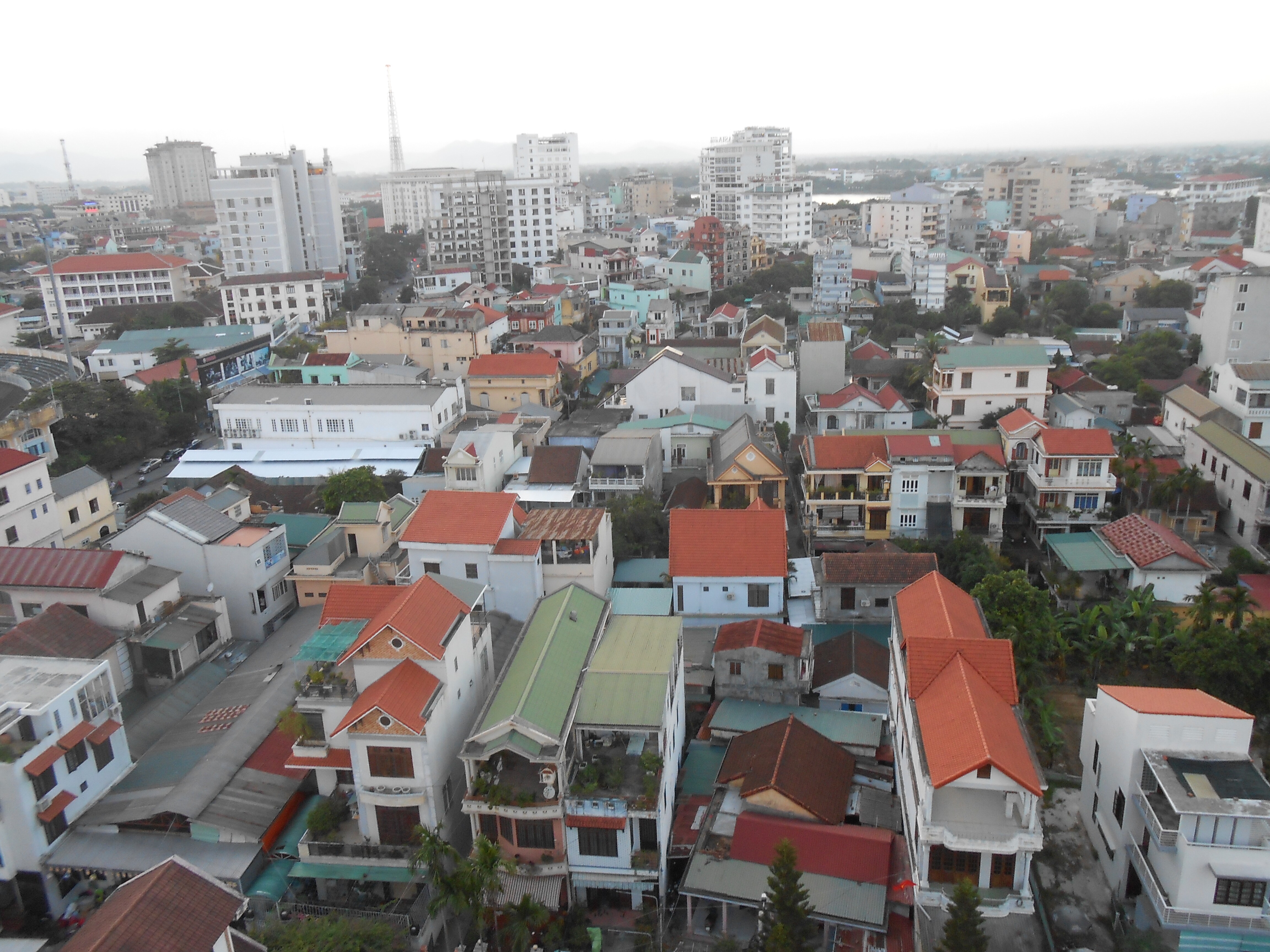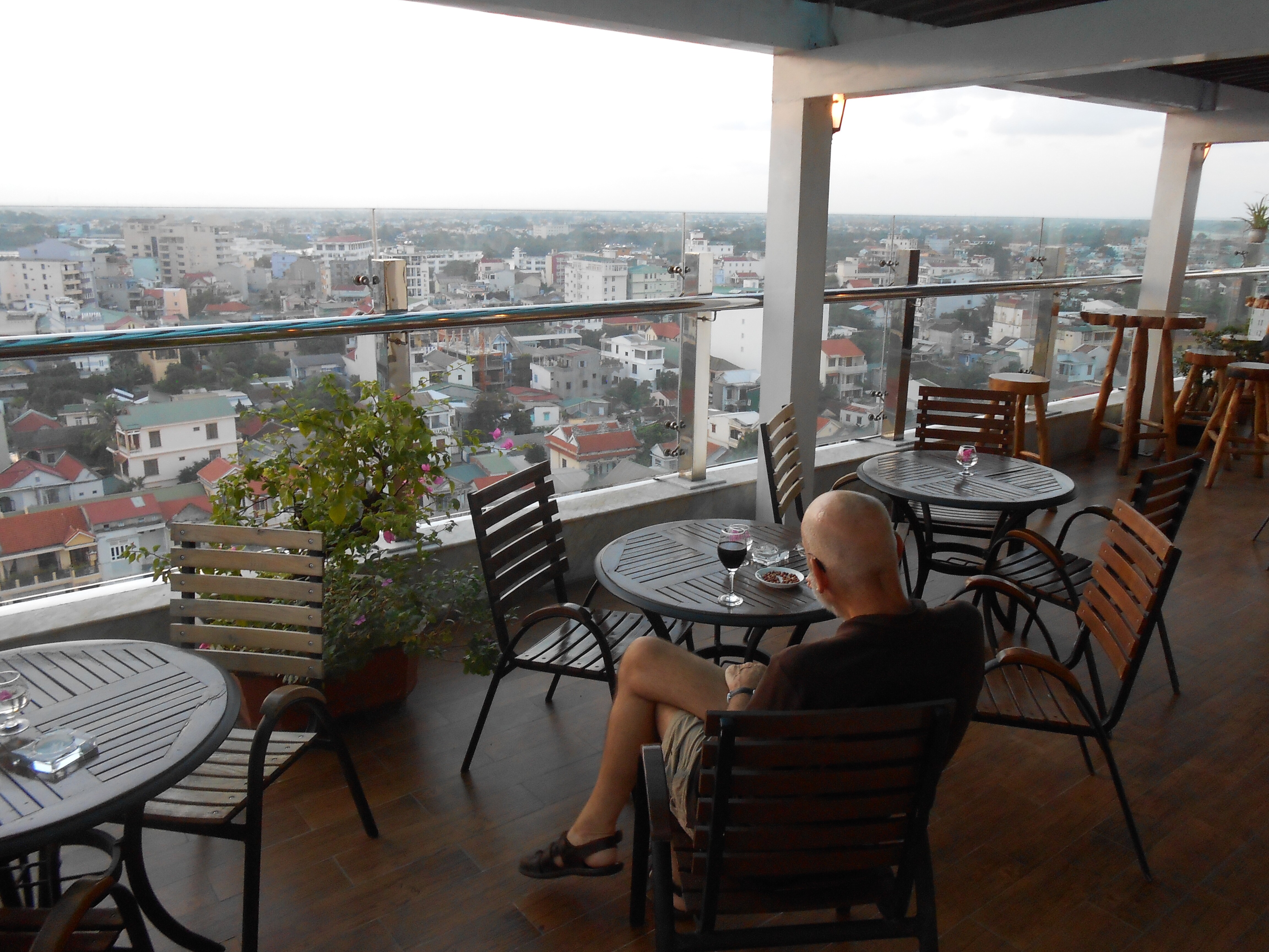 Joe and I took a quiet moment to sit on the deck on the 12th floor of our hotel, The Gold Hotel, and look out over Hue, toward the Perfume River. Hue is in the middle of Vietnam, about 15 K from the sea. It is a city of one million with many colleges and universities. It is the cultural and historical heart of Vietnam and the seat of the old emperors.
