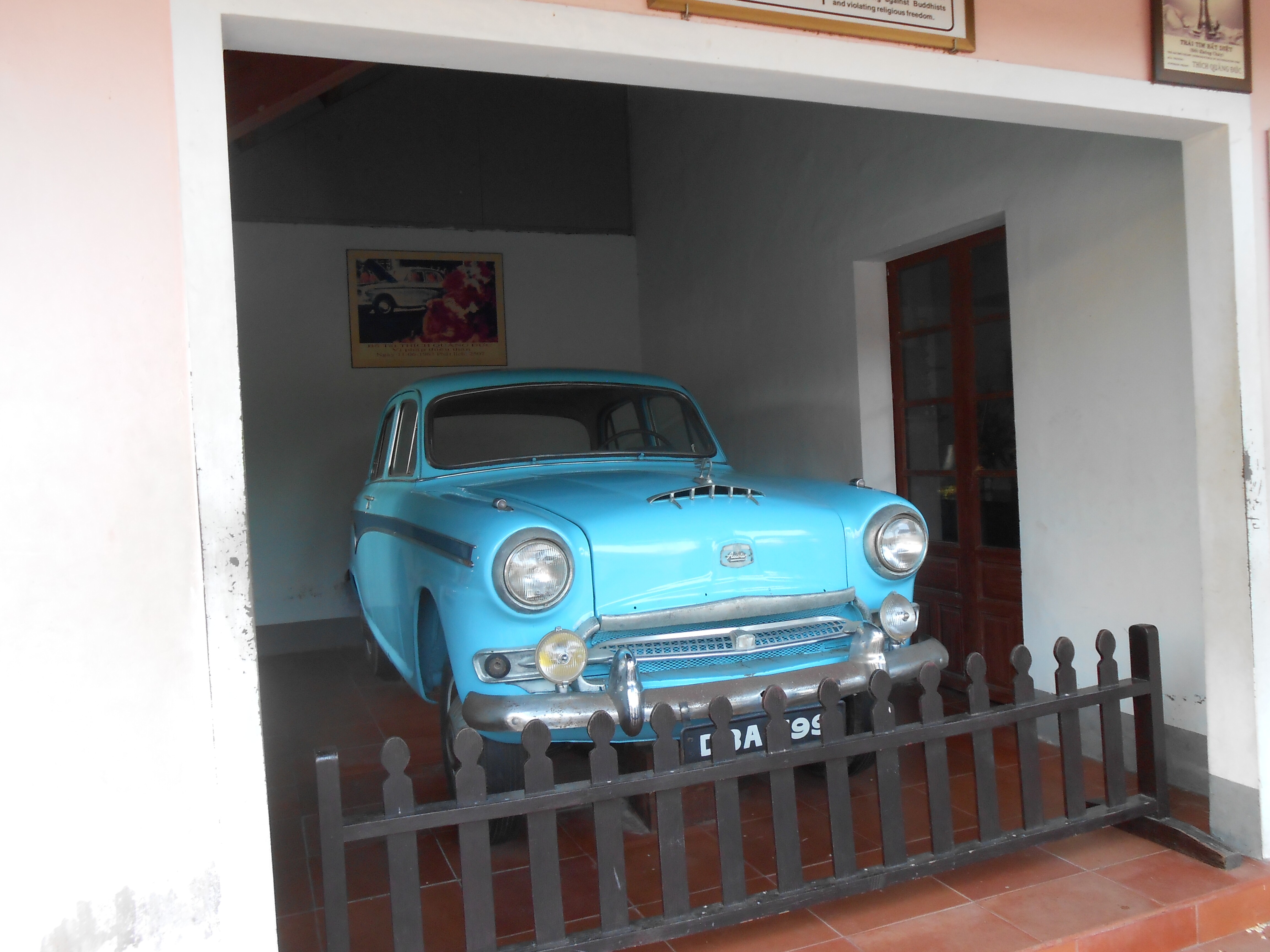 The car that drove him to that intersection is on display at Xa Loi Pagoda. The Pagoda is more than just one building with ceremonial spaces. It’s a whole monastery, with dormitories and many young monks in gray robes. It sits on a high bluff overlooking the Perfume River, nearly across from the Citadel.