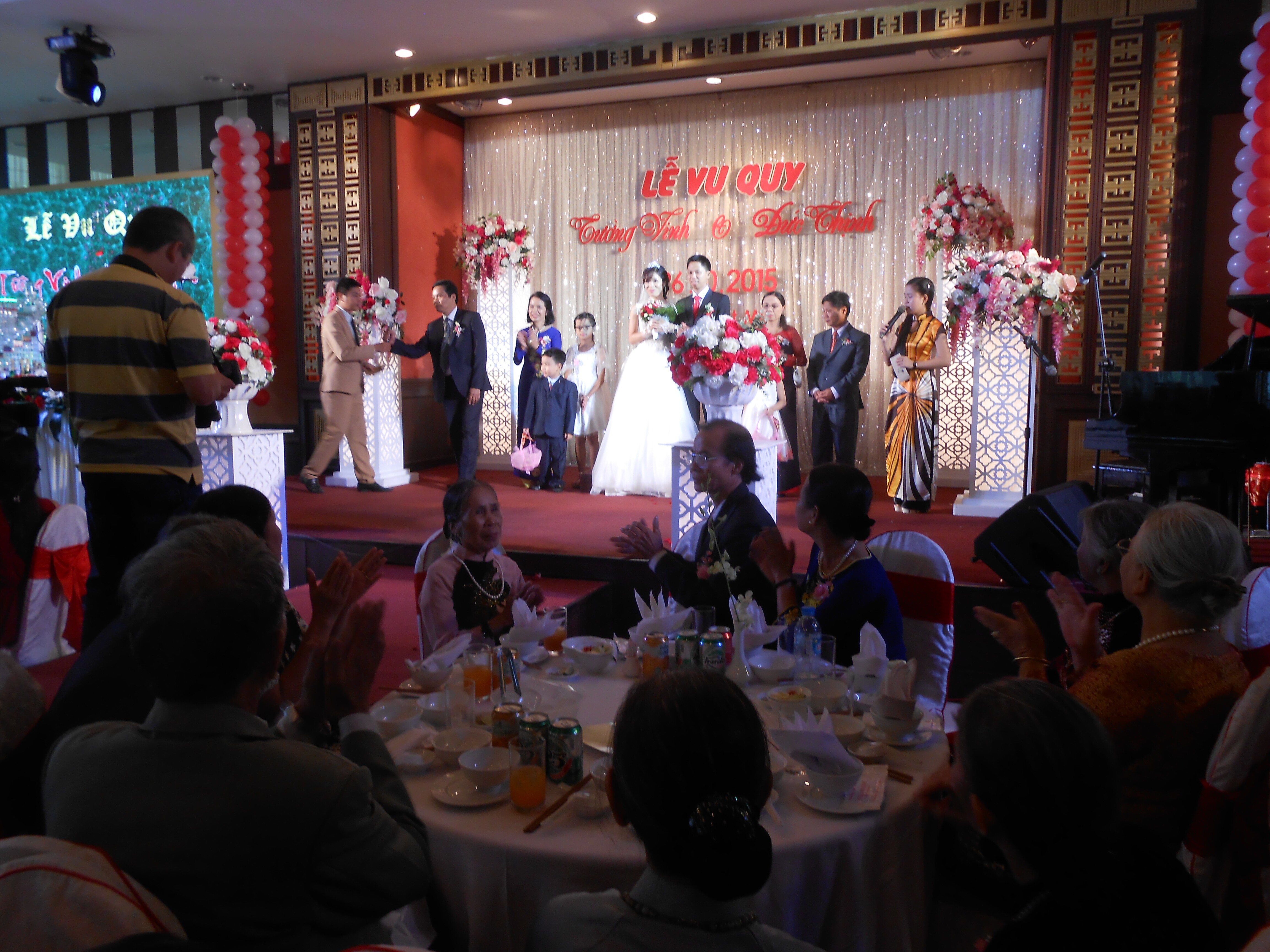 This is the major media moment, when the whole family is assembled onstage at the big banquet. There was entertainment throughout the meal — many singers, and a great clown show (see below)