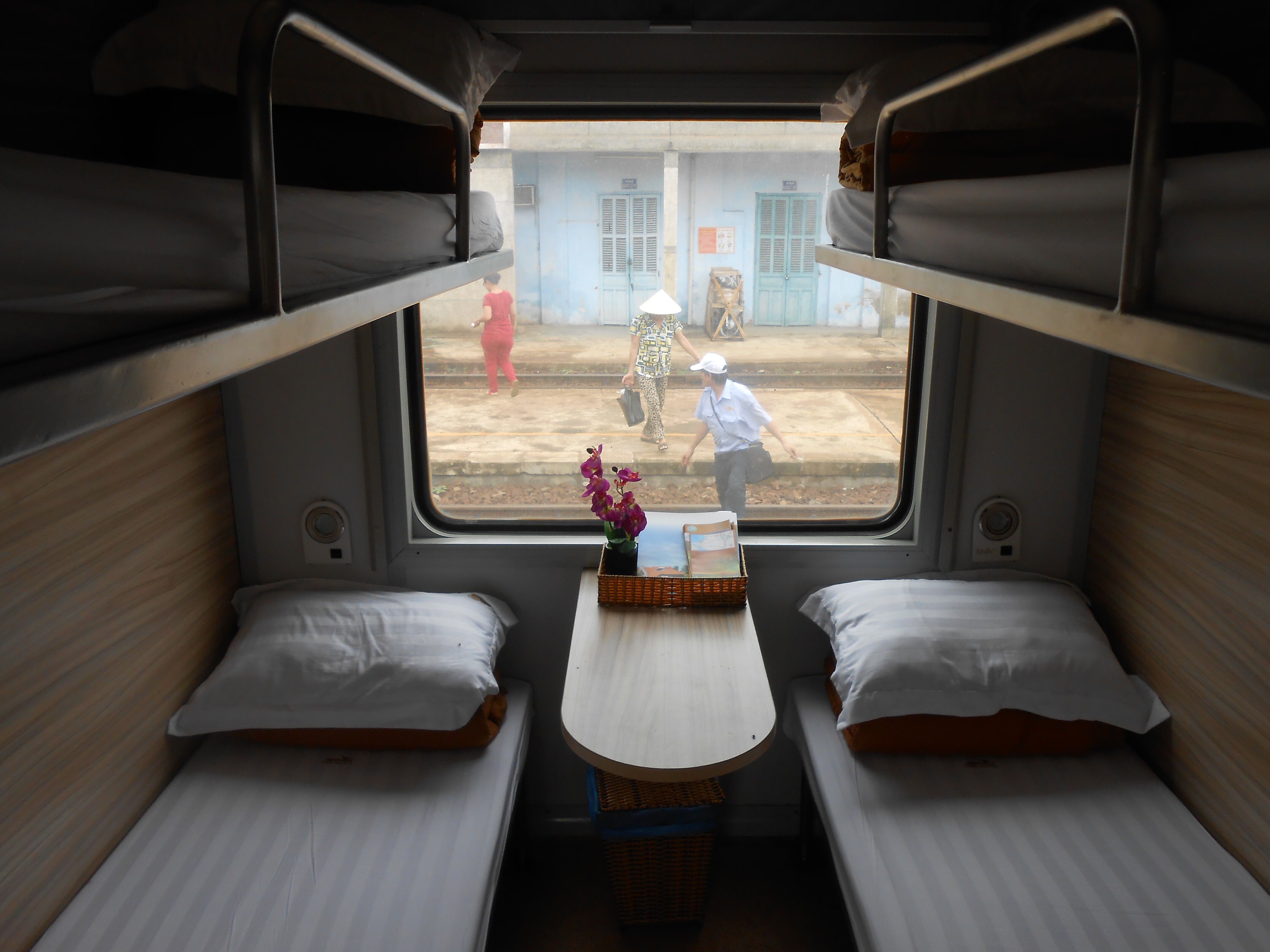 We got there on a train, about 6 hours, leaving Ga Saigon (all the train stations are called “Ga” something, as in gare, French) at about 1 pm and getting in around 7. Our guide was T’ung’s grandmother, who was in a cabin two down from ours. She sat half- lotus-position (the woman is in her 80s) on her seat and chatted with other people in her cabin, but came out and warned us when we were three stops from arriving.