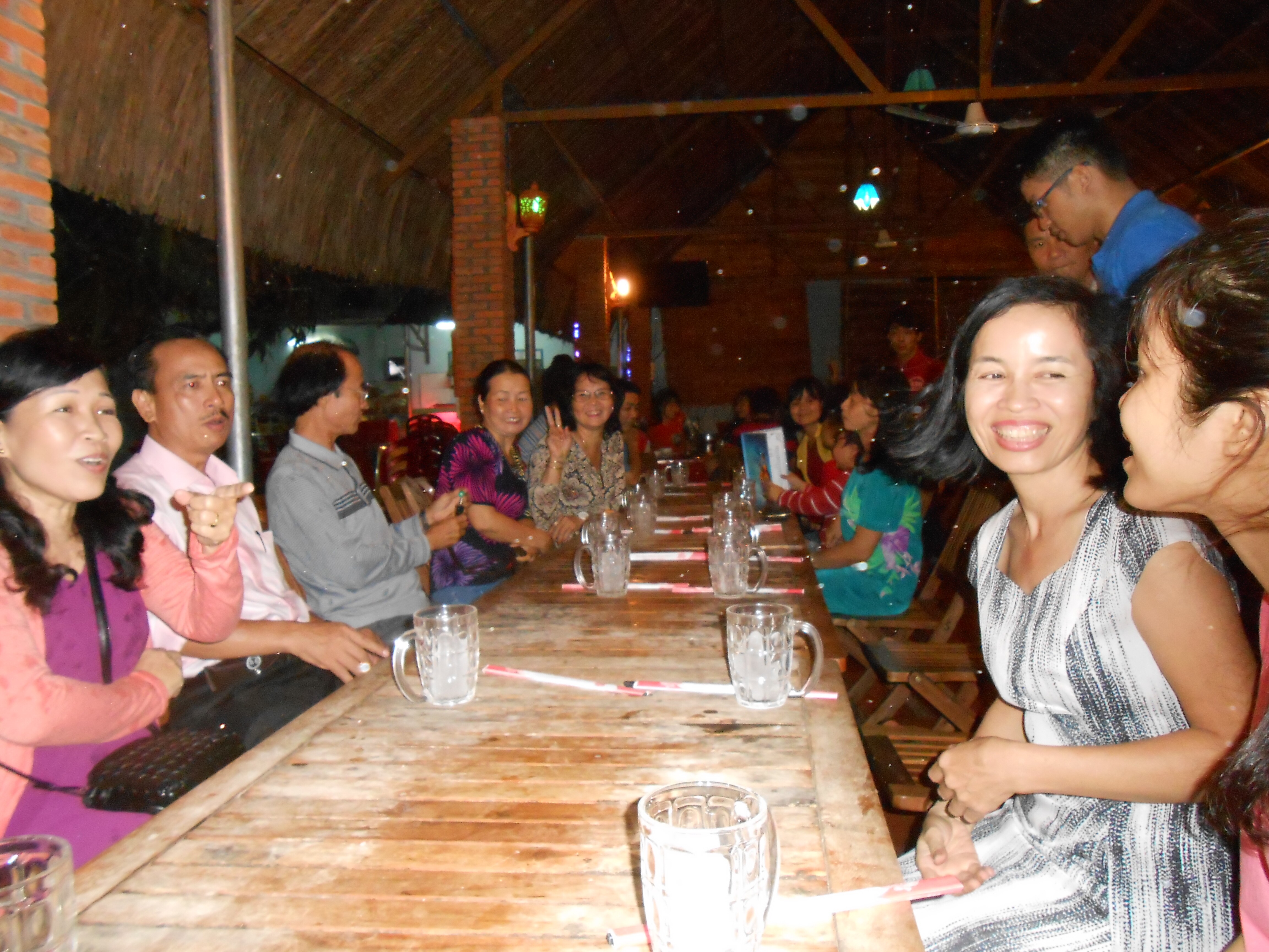 After being dropped at our hotel, we were taken in a van to the first of many, many meals, the central substance of which was very, very fresh seafood. This means everything from mussels to oysters to crabs to squid and octopus, to “fish” from the ocean with no English name. We were between thirty and forty people eating at long tables, drinking much beer. The picture above is from the first such dinner, on a terrace roofed with bamboo and rain pouring down. That’s Vinh’s mother on the right, smiling and looking about 15 years old.