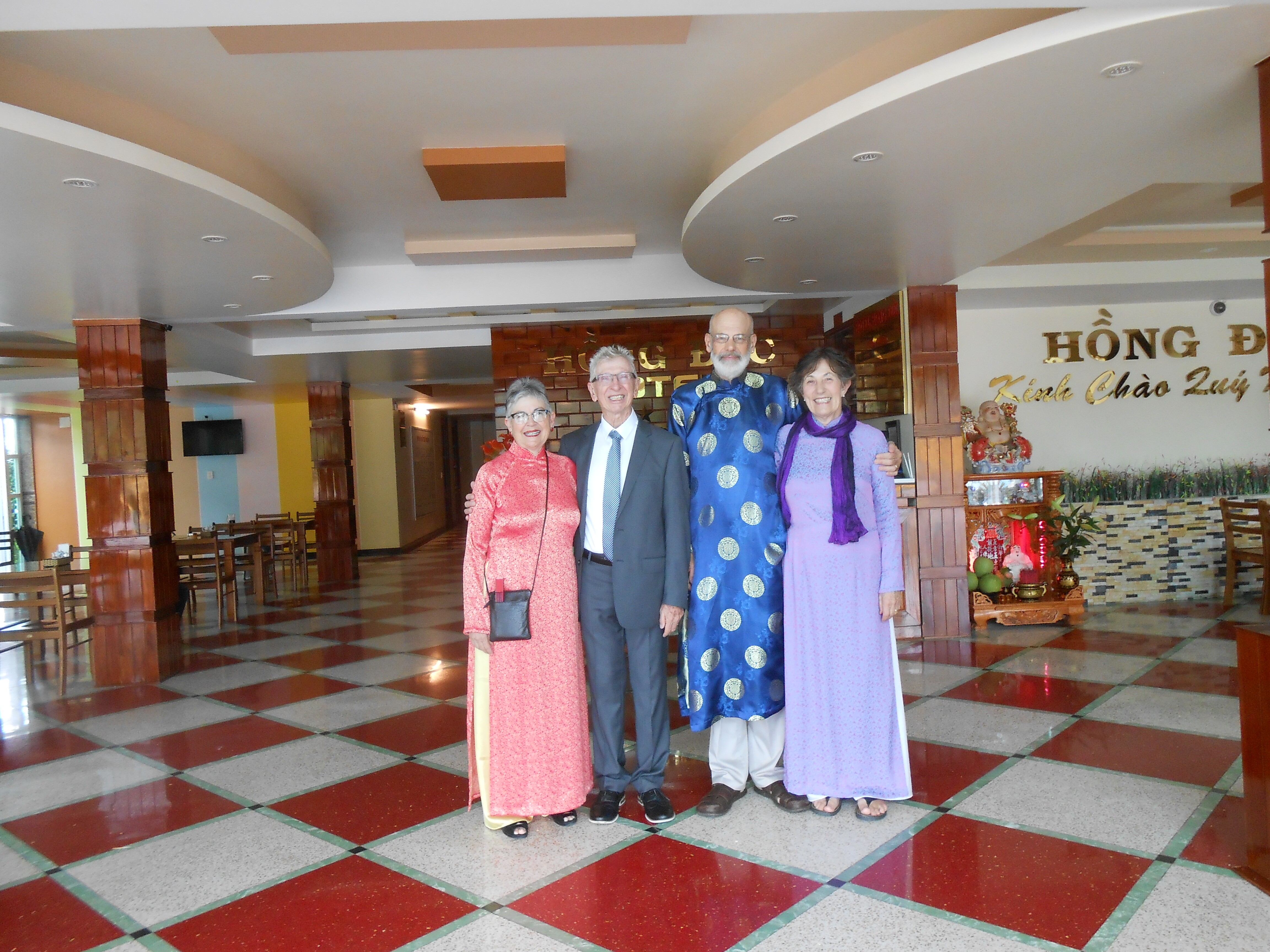 This is us in our wedding ao-dais in the lobby of the hotel where we stayed. We wore these to the ceremony, the lunch after the ceremony, and the “party” — another huge formal dinner -that evening.