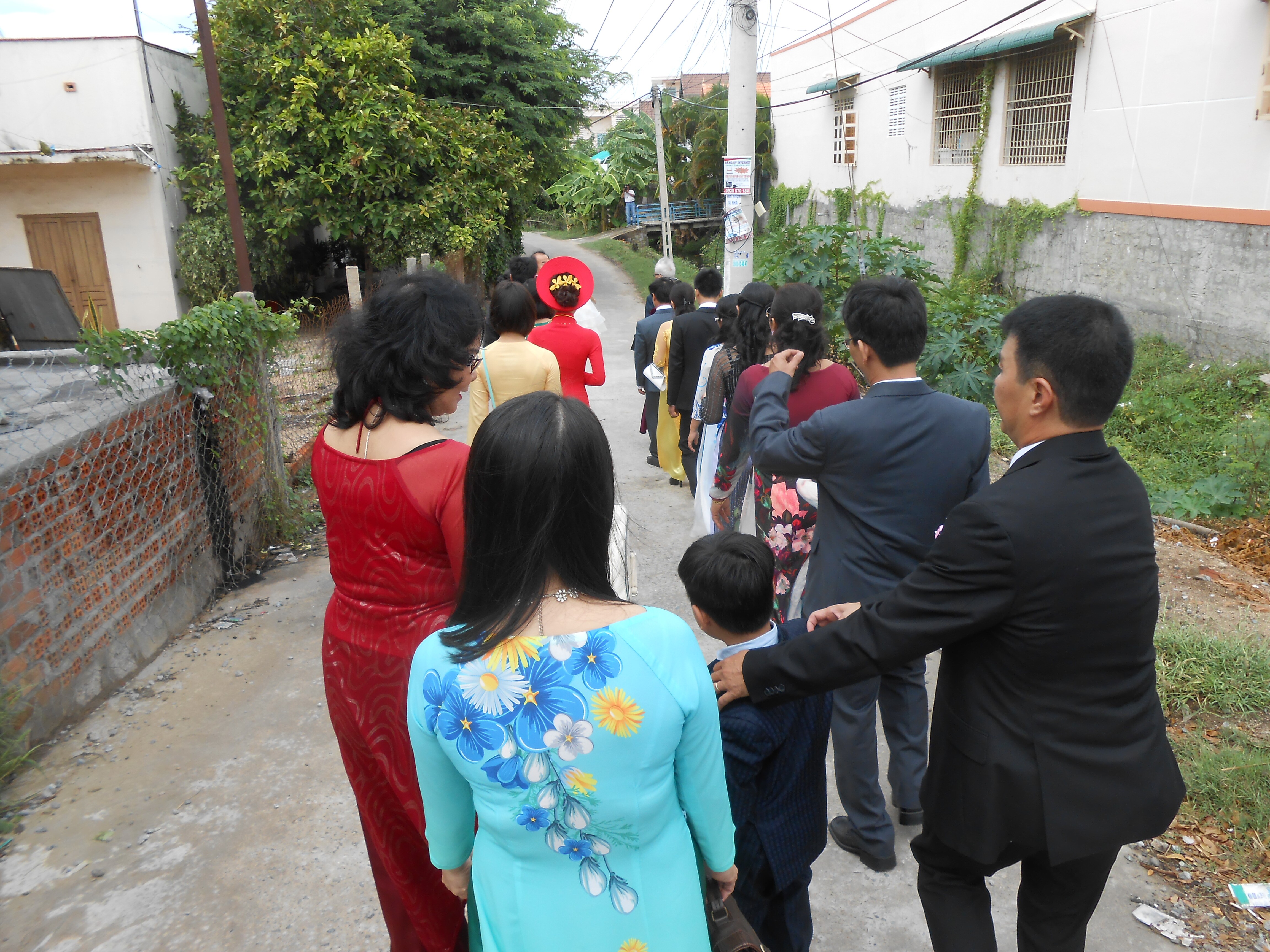 In the morning, the husband’s family comes to our hotel to get the bride. That’s T’ung’s grandfather leading, with two little nieces accompanying him. Inside the hotel, the bride’s family meets the husband’s family. That’s Vinh in the red ao dai and her father, in profile. the grandmother who was our guide is in the dark embroidered ao dai to the rear.