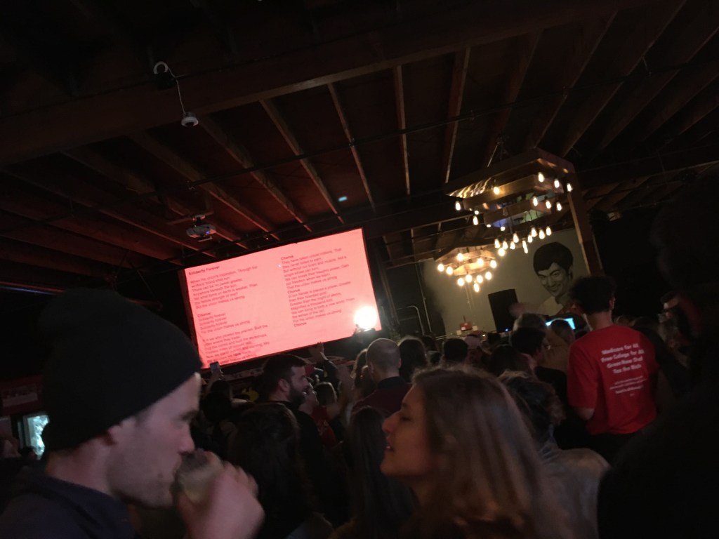 Last night Joe and I attended a DSA Bernie Watch Party at a venue near the West Oakland BART station called 7West. From what I could tell driving through the neighborhood in the dark, it has gentrified like mad in the last 10 years; no longer artists’ lofts, warehouses, empty lots, debris left over from the 1989 earthquake that knocked down the freeway where the four-lane Mandela Expressway now runs. But this transitional quality makes it a great venue for places where you need parking and space to dance and not pay a lot of money: it was huge; tables, a long bar, a big dance floor near the band, and then a big outdoor fenced-in area with bike racks and picnic tables.